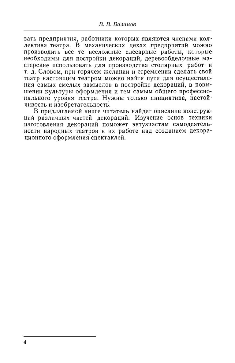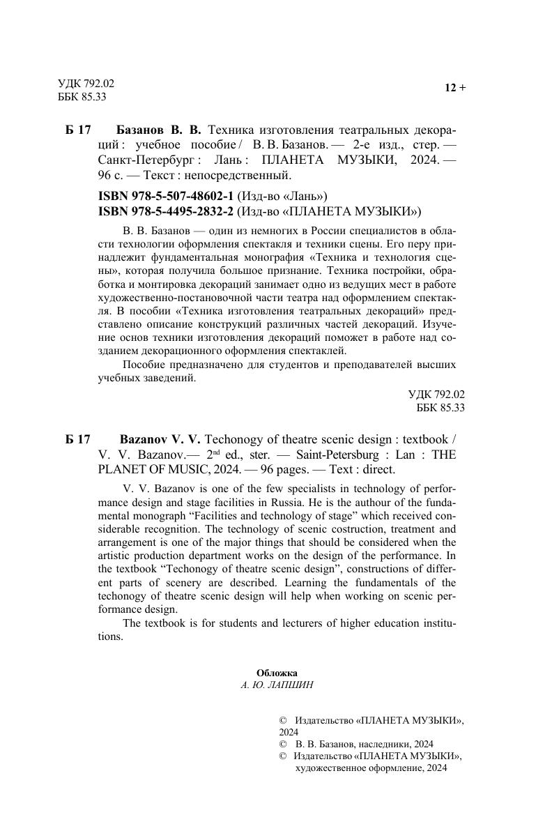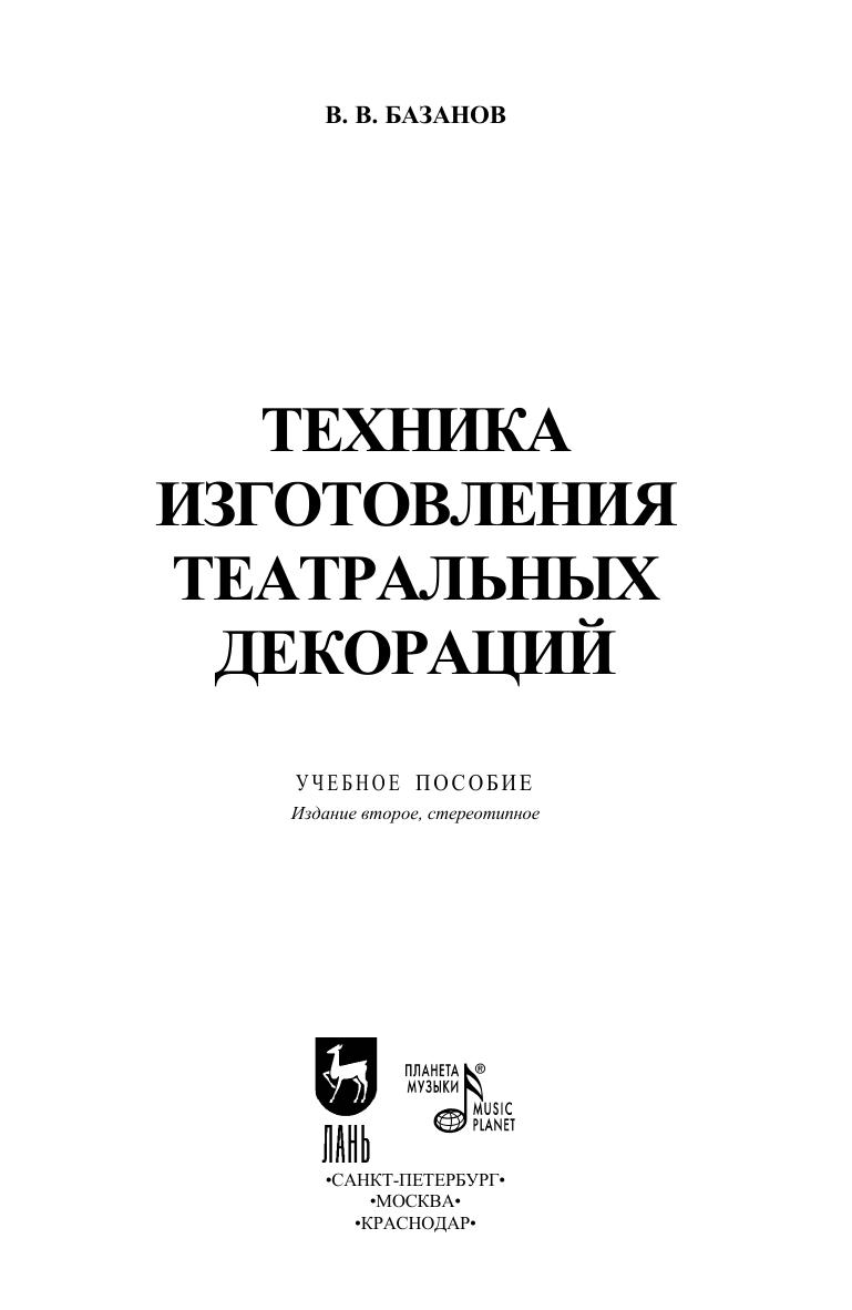 В. В. Базанов — один из немногих в России специалистов в области технологии оформления спектакля и техники сцены. Его перу принадлежит фундаментальная монография «Техника и тех-нология сцены», которая получила большое признание. Техника постройки, обработка и монтировка декораций занимает одно из ведущих мест в работе художественно-постановочной части теат-ра над оформлением спектакля. В пособии «Техника изготовления театральных декораций» представлено описание конструкций раз-личных частей декораций. Изучение основ техники изготовления декораций поможет в работе над созданием декорационного оформления спектаклей. Пособие предназначено для студентов и преподавателей высших учебных заведений. V. V. Bazanov is one of the few specialists in technology of per-formance design and stage facilities in Russia. He is the authour of the fundamental monograph “Facilities and technology of stage” which re-ceived considerable recognition. The technology of scenic costruction, treatment and arrangement is one of the major things that should be considered when the artistic production department works on the de-sign of the performance. In the textbook “Techonogy of theatre scenic design”, constructions of different parts of scenery are described. Learning the fundamentals of the techonogy of theatre scenic design will help when working on scenic performance design. The textbook is for students and lecturers of higher education in-stitutions.