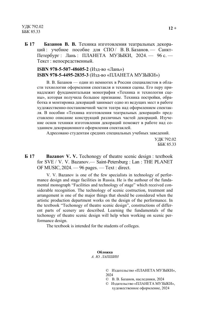 В. В. Базанов — один из немногих в России специалистов в области технологии оформления спектакля и техники сцены. Его перу принадлежит фундаментальная монография «Техника и технология сцены», которая получила большое признание. Техника постройки, обработка и монтировка декораций занимает одно из ведущих мест в работе художественно-постановочной части театра над оформлением спектакля. В пособии «Техника изготовления театральных декораций» представлено описание конструкций различных частей декораций. Изучение основ техники изготовления декораций поможет в работе над созданием декорационного оформления спектаклей. Адресовано студентам средних специальных учебных заведений. V. V. Bazanov is one of the few specialists in technology of per-formance design and stage facilities in Russia. He is the authour of the fundamental monograph “Facilities and technology of stage” which re-ceived considerable recognition. The technology of scenic costruction, treatment and arrangement is one of the major things that should be considered when the artistic production department works on the de-sign of the performance. In the textbook “Techonogy of theatre scenic design”, constructions of different parts of scenery are described. Learning the fundamentals of the techonogy of theatre scenic design will help when working on scenic performance design. The textbook is intended for the students of colleges.