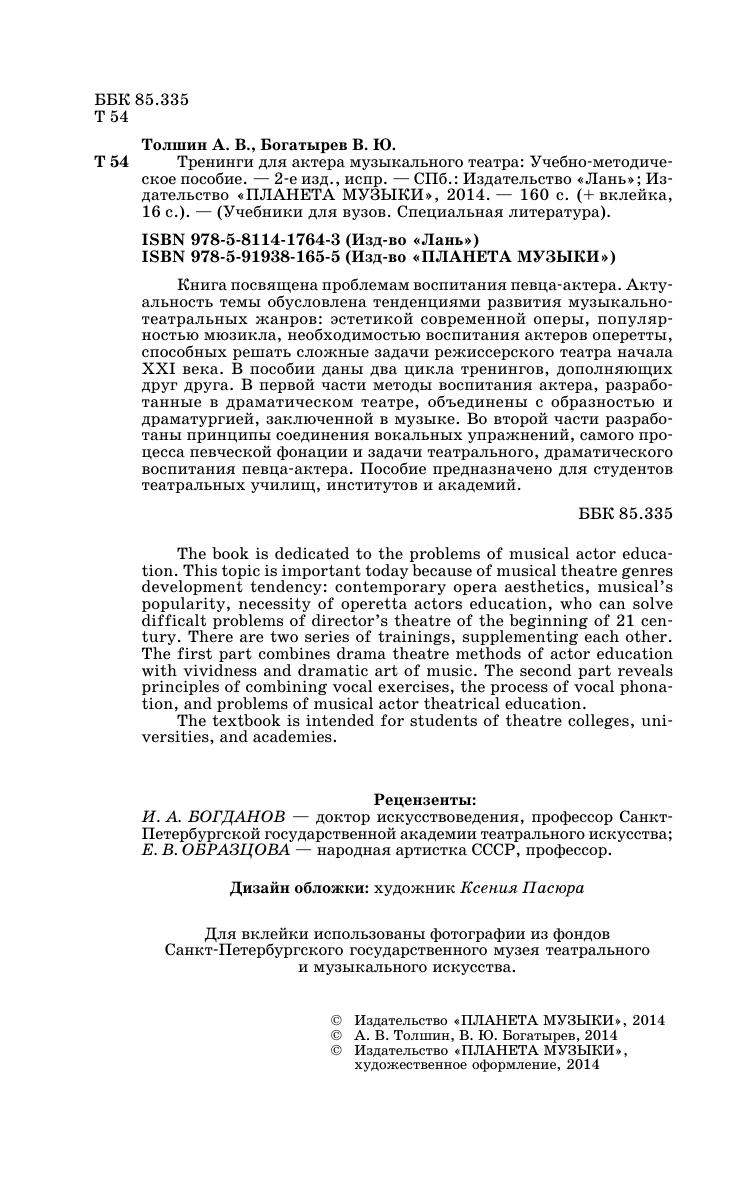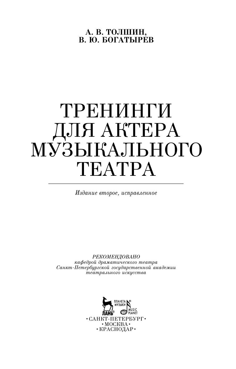 The book is dedicated to the problems of musical actor education. This topic is important today because of musical theatre genres development tendency: contemporary opera aesthetics, musical’s popularity, necessity of operetta actors education, who can solve difficalt problems of director’s theatre of the beginning of 21 century. There are two series of trainings, supplementing each other. The first part combines drama theatre methods of actor education with vividness and dramatic art of music. The second part reveals principles of combining vocal exercises, the process of vocal phonation, and problems of musical actor theatrical education.