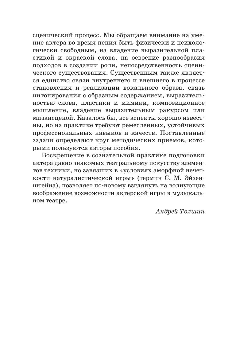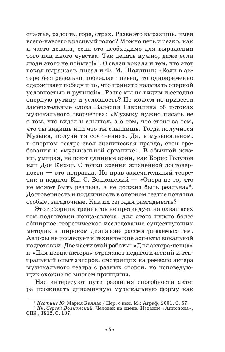 Книга посвящена проблемам воспитания певца-актера. Актуальность темы обусловлена тенденциями развития музыкально-театральных жанров: эстетикой современной оперы, популярностью мюзикла, необходимостью воспитания актеров оперетты, способных решать сложные задачи режиссерского театра начала XXI века.В пособии даны два цикла тренингов, дополняющих друг друга. В первой части методы воспитания актера, разработанные в драматическом театре, объединены с образностью и драматургией, заключенной в музыке. Во второй части разработаны принципы соединения вокальных упражнений, самого процесса певческой фонации и задачи театрального, драматического воспитания певца-актера.Пособие предназначено для студентов театральных училищ, институтов и академий.