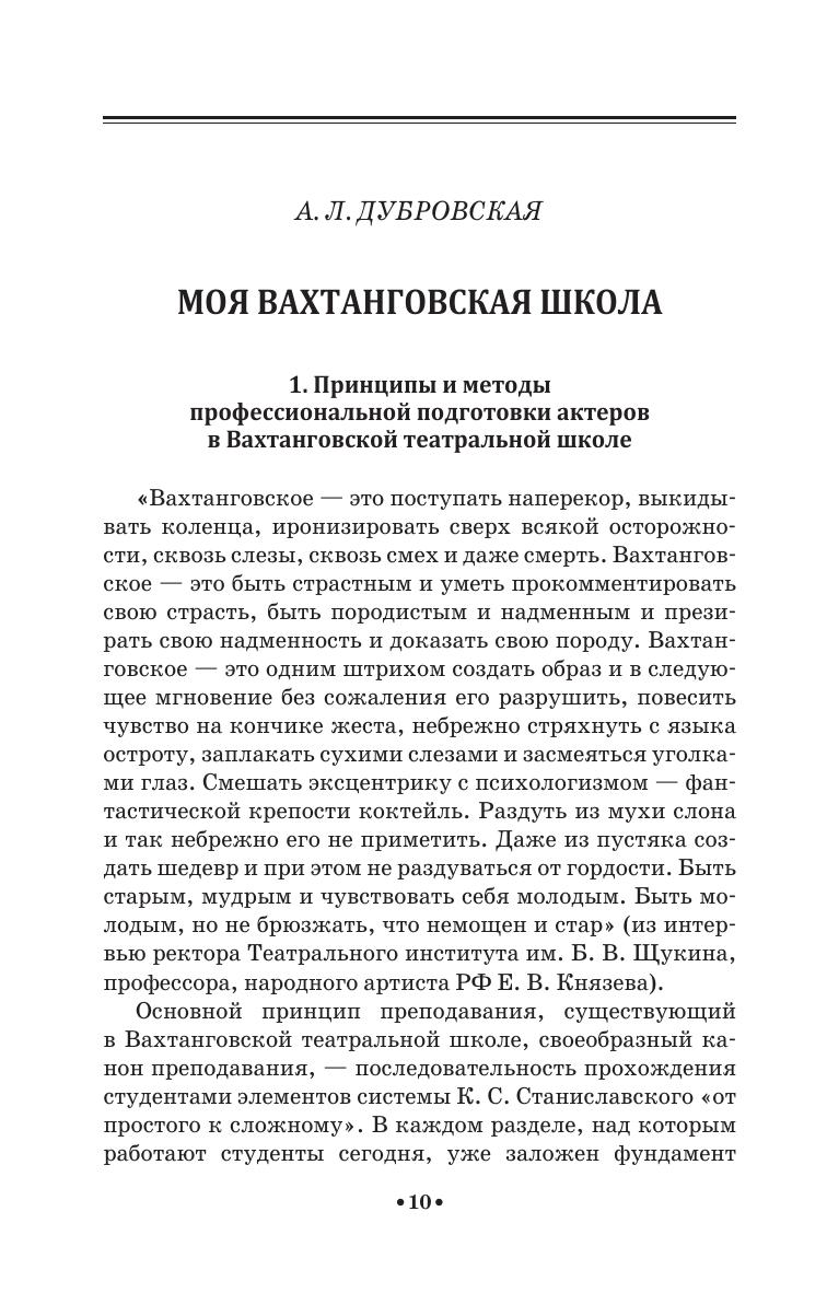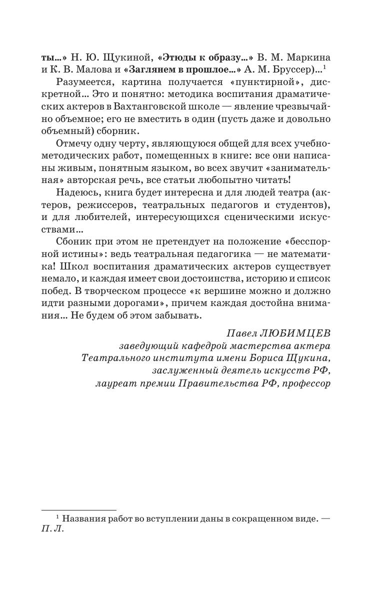 Предлагаемый вниманию читателей сборник учебно-методических пособий под общей редакцией П. Е. Любимцева призван раскрыть, в общедоступной, доходчивой форме, некоторые технологические моменты, показать Вахтанговскую школу изнутри, в ее рабочем процессе. В издание включены как практические работы, Тренинг... Н. Н. Павленковой и Тренинг В. П. Поглазова, Ритм и темп Н. Л. Ковалёвой, так и общетеоретические - Моя Вахтанговская школа А. Л. Дубровской, Воспитание артиста музыкального театра... М. А. Швыдкой, а также историко-теоретические - Самостоятельные работы... Н. Ю. Щукиной, Этюды к образу... В. М. Маркина и К. В. Малова и Заглянем в прошлое... А. М. Бруссер. Книга предназначена для студентов и педагогов средних специальных учебных заведений. The collection of educational and methodological manuals edited by P. E. Lyubimtsev is intended to reveal, in an accessible way, some technical aspects, to show the Vakhtangov school from the inside, in its working process. The publication includes both practical works, Training ...by N. N. Pavlenkova and Training by V.P. Poglazov, Rhythm and tempo by N. L. Kovaleva and general theoretical studies - My Vakhtangov school by A. L. Dubrovskaya, Educating an artist of a musical theater ... by M. A. Shvydkoy, as well as historical and theoretical studies, ndependent works ... N. Y. Shchukina, Etudes to the image ... by V. M. Markin and K. V. Malov and Let's look into the past ... by A. M. Brusser. The book is intended for students and teachers of colleges.