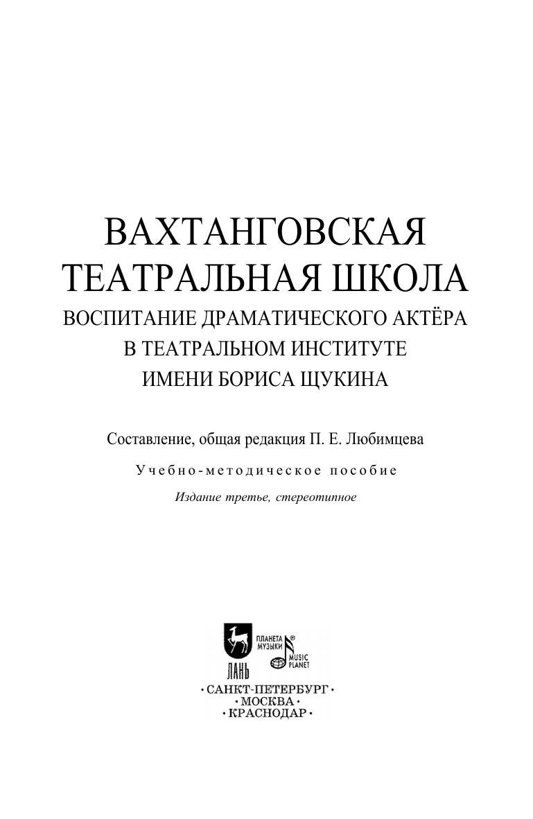Предлагаемый вниманию читателей сборник учебно-методических пособий под общей редакцией П. Е. Любимцева призван раскрыть, в общедоступной, доходчивой форме, некоторые технологические моменты, показать Вахтанговскую школу изнутри, в ее рабочем процессе. В издание включены как практические работы Тренинг... Н. Н. Павленковой и Тренинг В. П. Поглазова, Ритм и темп Н. Л. Ковалёвой, так и общетеоретические Моя Вахтанговская школа А. Л. Дубровской, Воспитание артиста музыкального театра... М. А. Швыдкой, а также историко-теоретические Самостоятельные работы... Н. Ю. Щукиной, Этюды к образу... В. М. Маркина и К. В. Малова и Заглянем в прошлое... А. М. Бруссер. Книга будет интересна и для людей театра, актёров, режиссёров, театральных педагогов и студентов, и для любителей, интересующихся сценическими искусствами.