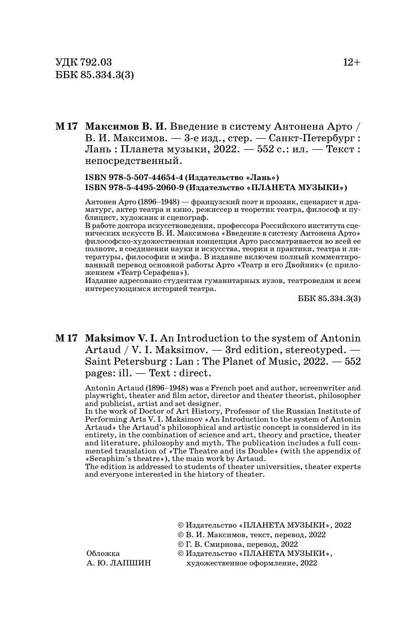 В работе доктора искусствоведения, профессора Российского института сценических искусств В. И. Максимова «Введение в систему Антонена Арто» философско-художественная концепция Арто рассматривается во всей ее полноте, в соединении науки и искусства, теории и практики, театра и литературы, философии и мифа.