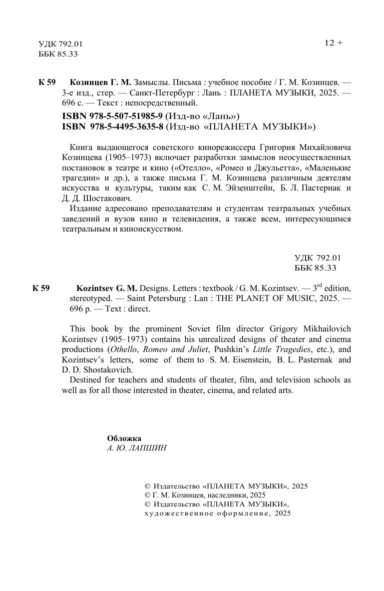 Книга выдающегося советского кинорежиссера Григория Михайловича Козинцева (1905–1973) включает разработки замыслов неосуществленных постановок в театре и кино («Отелло», «Ромео и Джульетта», «Маленькие трагедии» и др.), а также письма Г. М. Козинцева различным деятелям искусства и культуры, таким как С. М. Эйзенштейн, Б. Л. Пастернак и Д. Д. Шостакович. Издание адресовано преподавателям и студентам театральных учебных заведений и вузов кино и телевидения, а также всем, интересующимся театральным и киноискусством.