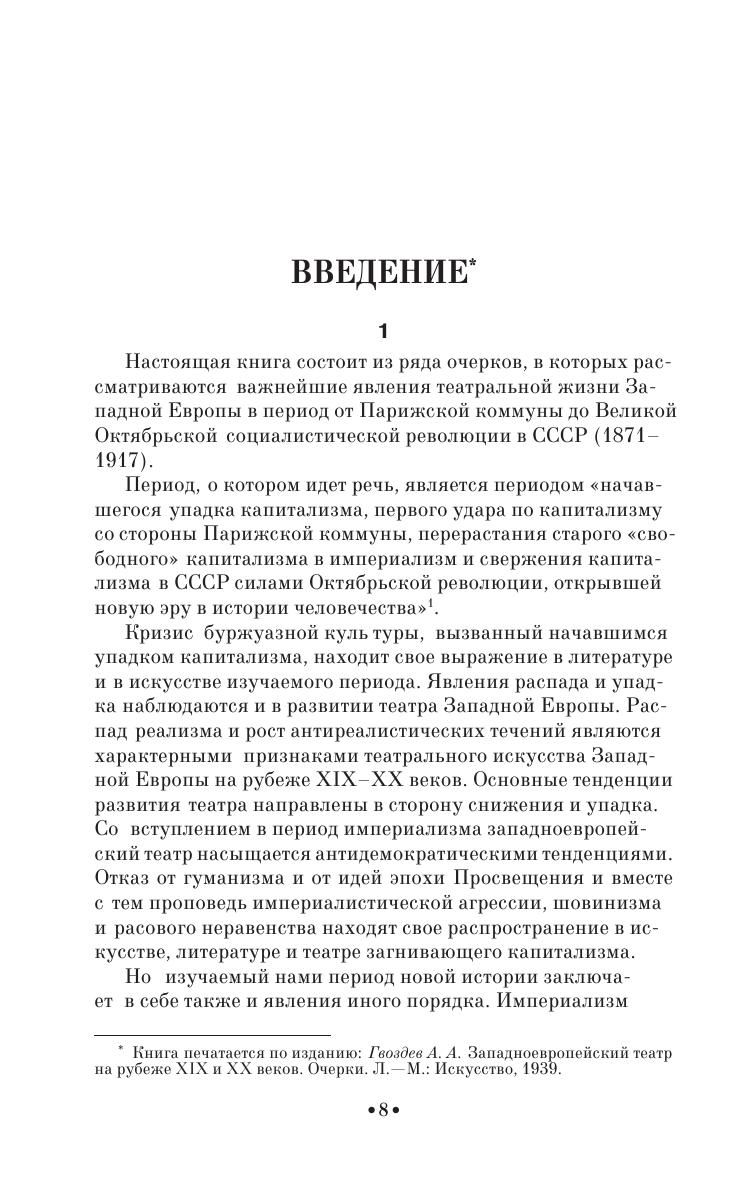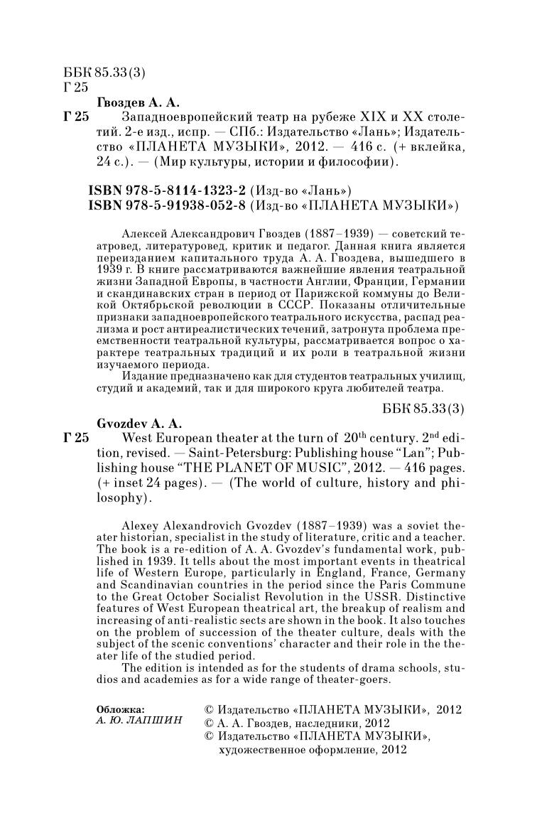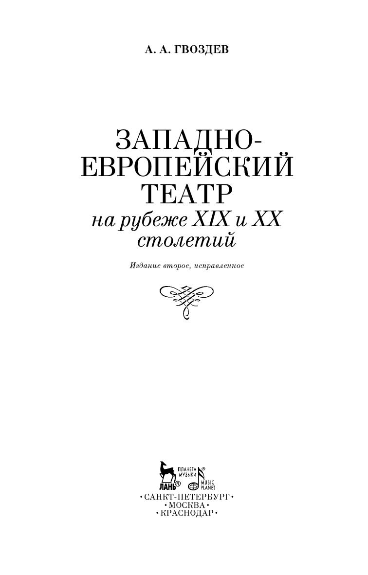 Alexey Alexandrovich Gvozdev (1887–1939) was a soviet theater historian, specialist in the study of literature, critic and a teacher. The book is a re-edition of A. A. Gvozdev’s fundamental work, published in 1939. It tells about the most important events in theatrical life of Western Europe, particularly in England, France, Germany and Scandinavian countries in the period since the Paris Commune to the Great October Socialist Revolution in the USSR. Distinctive features of West European theatrical art, the breakup of realism and increasing of anti-realistic sects are shown in the book. It also touches on the problem of succession of the theater culture, deals with the subject of the scenic conventions’ character and their role in the theater life of the studied period. The edition is intended as for the students of drama schools, studios and academies as for a wide range of theater-goers.
