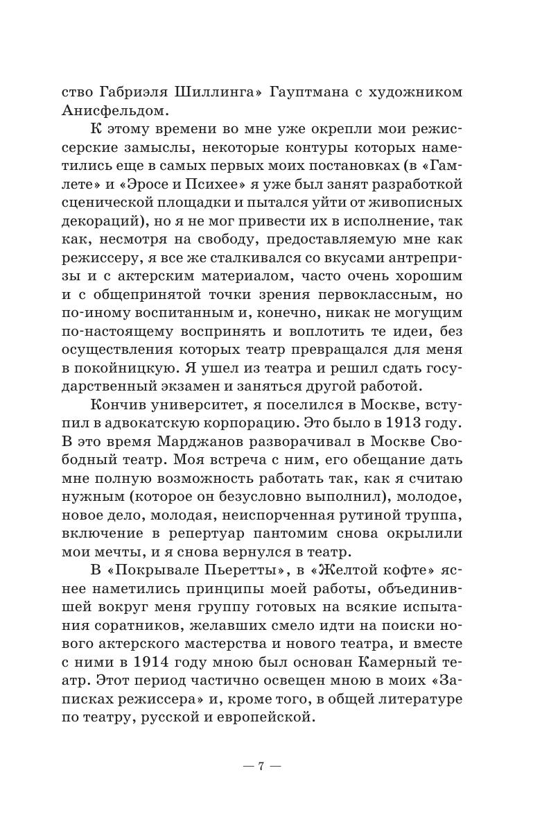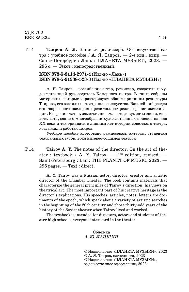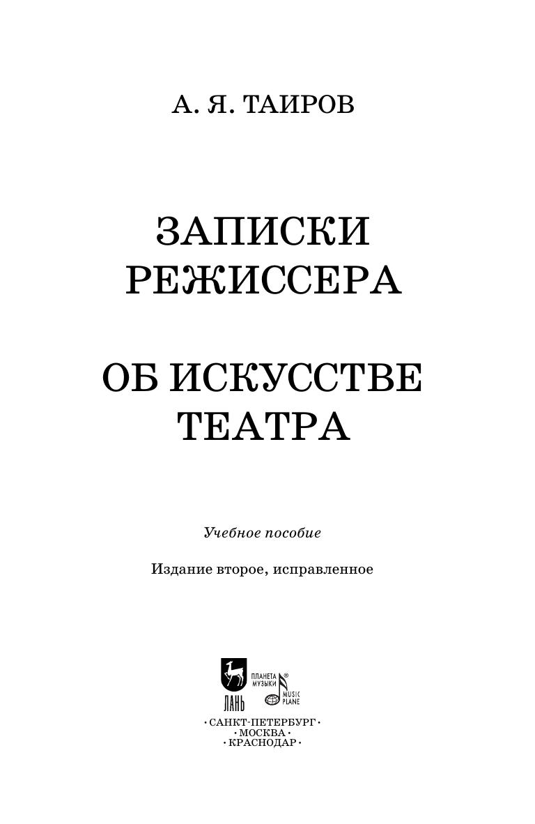 А. Я. Таиров – российский актер, режиссер, создатель и художественный руководитель Камерного театра. В книге собраны материалы, которые характеризуют общие принципы режиссуры Таирова, его взгляды на театральное искусство. Важнейший раздел его творческого наследия представляют режиссерские экспликации. Его речи, статьи, заметки, письма – это документы эпохи, свидетельствующие о многообразии художественных поисков начала XX века и тех тридцати с лишним лет истории советского театра, когда жил и работал Таиров. Учебное пособие адресовано режиссерам, актерам, студентам театральных вузов, всем интересующимся театром. A. Y. Tairov was a Russian actor, director, creator and artistic director of the Chamber Theater. The book contains materials that characterize the general principles of Tairov's direction, his views on theatrical art. The most important part of his creative heritage is the director's explications. His speeches, articles, notes, letters are documents of the epoch, which speak about a variety of artistic searches in the beginning of the 20th century and those thirty-odd years of the history of the Soviet theater when Tairov lived and worked. The textbook is intended for directors, actors and students of theater high schools, everyone interested in the theater.