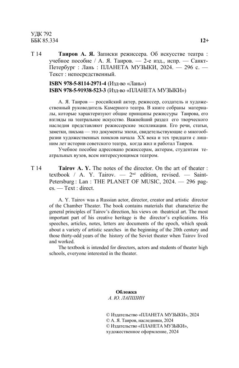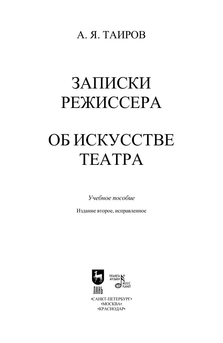 А. Я. Таиров – российский актер, режиссер, создатель и художественный руководитель Камерного театра. В книге собраны материалы, которые характеризуют общие принципы режиссуры Таирова, его взгляды на театральное искусство. Важнейший раздел его творческого наследия представляют режиссерские экспликации. Его речи, статьи, заметки, письма – это документы эпохи, свидетельствующие о многообразии художественных поисков начала XX века и тех тридцати с лишним лет истории советского театра, когда жил и работал Таиров. Учебное пособие адресовано режиссерам, актерам, студентам театральных вузов, всем интересующимся театром. A. Y. Tairov was a Russian actor, director, creator and artistic director of the Chamber Theater. The book contains materials that characterize the general principles of Tairov's direction, his views on theatrical art. The most important part of his creative heritage is the director's explications. His speeches, articles, notes, letters are documents of the epoch, which speak about a variety of artistic searches in the beginning of the 20th century and those thirty-odd years of the history of the Soviet theater when Tairov lived and worked. The textbook is intended for directors, actors and students of theater high schools, everyone interested in the theater.