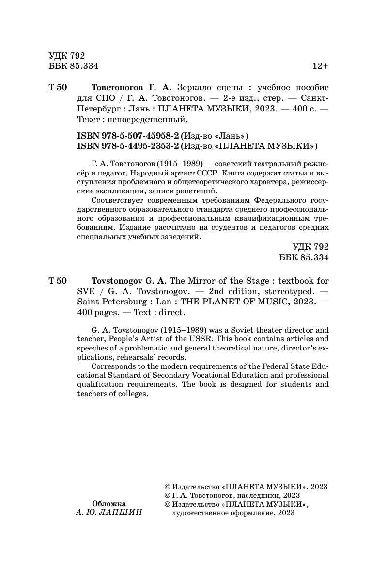 G. A. Tovstonogov (1915-1989) was a Soviet theater director and teacher, People's Artist of the USSR. This book contains articles and speeches of a problematic and general theoretical nature, director’s explications, rehearsals’ records. Corresponds to the modern requirements of the Federal State Educational Standard of Secondary Vocational Education and professional qualification requirements.