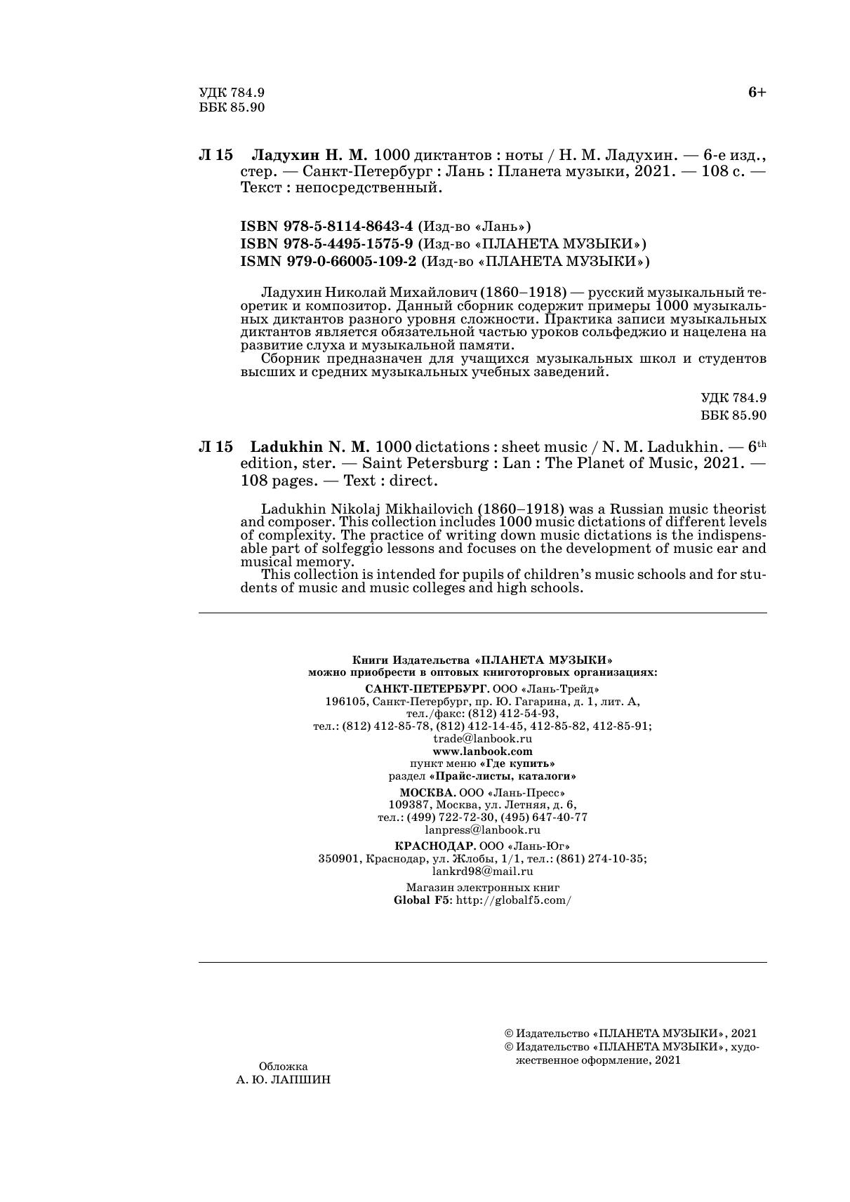 Ладухин Николай Михайлович (I860 – 1918) – русский музыкальный теоретик и композитор. Данный сборник содержит примеры 1000 музыкальных диктантов разного уровня сложности. Практика записи музыкальных диктантов является обязательной частью уроков сольфеджио и нацелена на развитие слуха и музыкальной памяти.