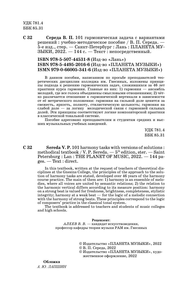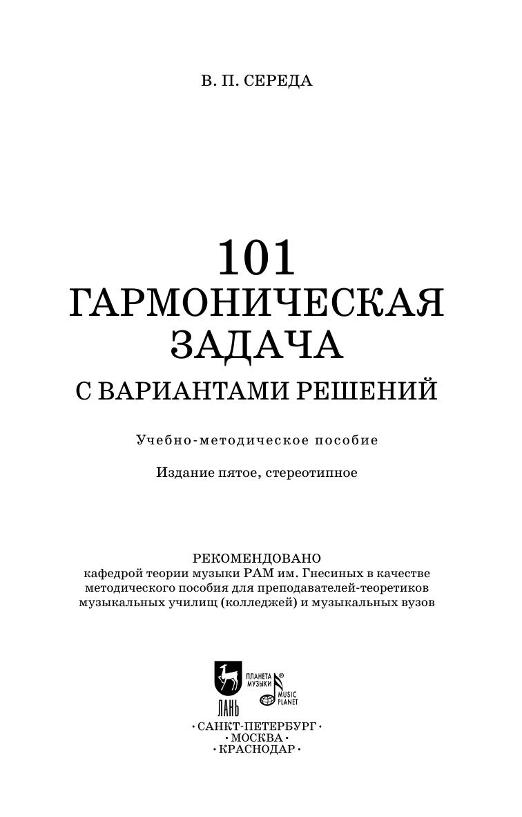 In this textbook, written at the request of teachers of theoretical disciplines at the Gnesins College, the principles of the approach to the solution of harmony tasks are stated, developed over 46 years of the harmony course practice. The main of them are: 1) harmony is an ensemble of melodies, where all voices are united by semantic relations; 2) the relation to the harmonic vertical differs according to its measure position: harmony on a strong beat is valued for freshness, brightness, completeness, stylistic integrity; harmony at a weak beat - for the logic of a melodic connection with the harmony of strong beats. These principles correspond to the logic of composers’ practice in the classical tonal system.