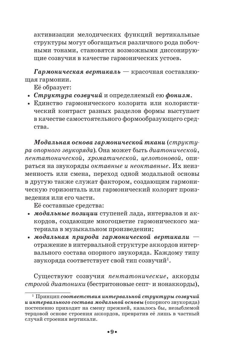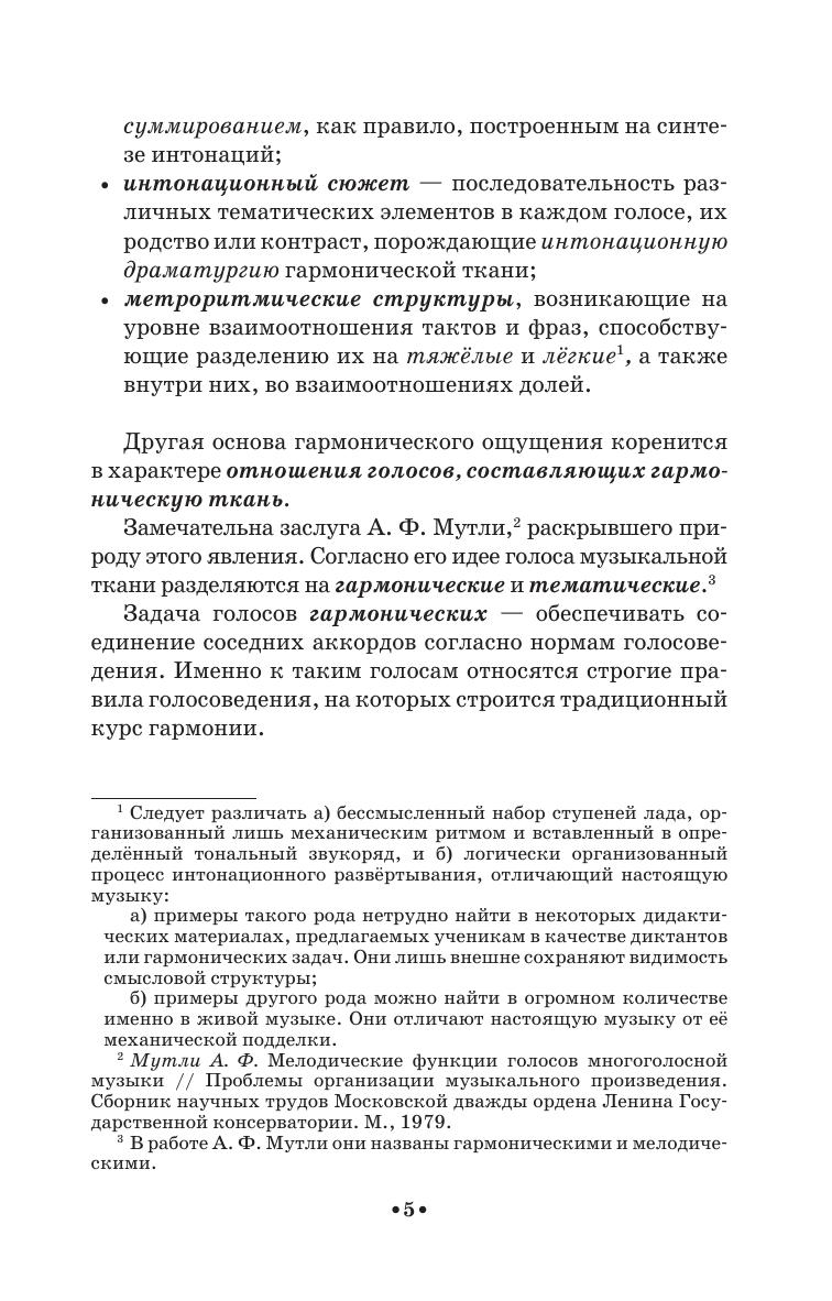 В данном пособии, написанном по просьбе преподавателей теоретических дисциплин колледжа им. Гнесиных, изложены принципы подхода к решению гармонических задач, сложившиеся за 46 лет практики курса гармонии. Главные из них: 1) гармония – ансамбль мелодий, где все голоса объединены смысловыми отношениями, 2) чётко различается отношение к гармонической вертикали в зависимости от её метрического положения: гармония на сильной доле ценится за свежесть, яркость, полноту, стилистическую цельность, гармония на слабой доле – за логику мелодической связи с гармонией сильных долей. Эти принципы соответствуют логике композиторской практики в классической тональной системе. Пособие адресовано преподавателям и студентам средних музыкальных учебных заведений. In this textbook, written at the request of teachers of theoretical disciplines at the Gnesins College, the principles of the approach to the solution of harmony tasks are stated, developed over 46 years of the harmony course practice. The main of them are: 1) harmony is an ensemble of melodies, where all voices are united by semantic relations, 2) the relation to the harmonic vertical differs according to its measure position: harmony on a strong beat is valued for freshness, brightness, completeness, stylistic integrity, harmony at a weak beat - for the logic of a melodic connection with the harmony of strong beats. These principles correspond to the logic of composers’ practice in the classical tonal system. The textbook is addressed to teachers and students of music colleges.