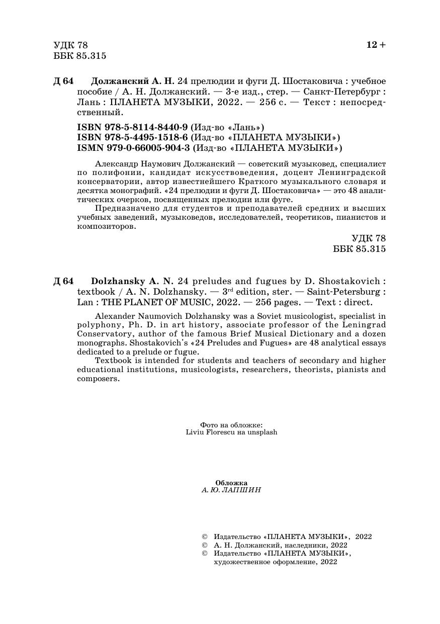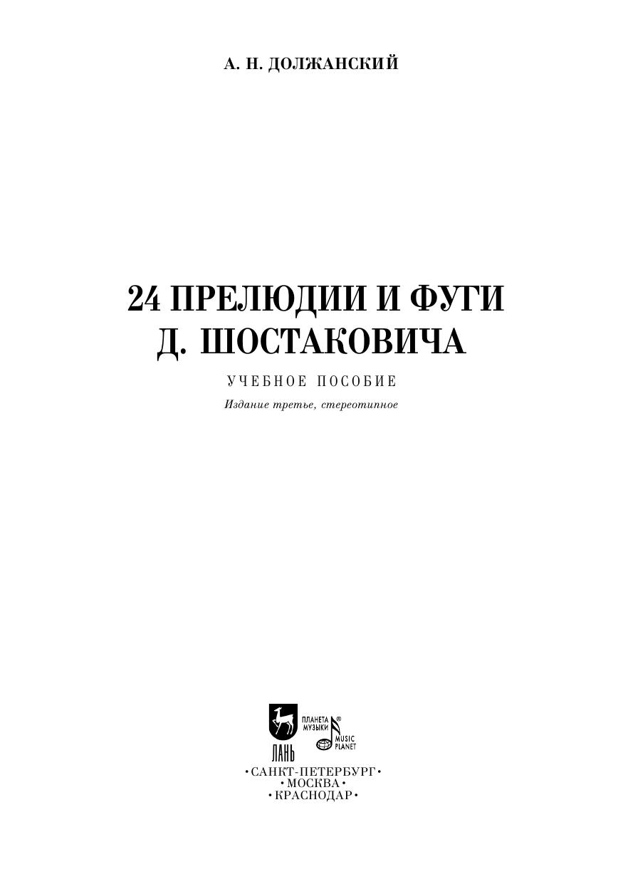 Alexander Naumovich Dolzhansky was a Soviet musicologist, specialist in polyphony, Ph. D. in art history, associate professor of the Leningrad Conservatory, author of the famous Brief Musical Dictionary and a dozen monographs. Shostakovich's «24 Preludes and Fugues» are 48 analytical essays dedicated to a prelude or fugue.