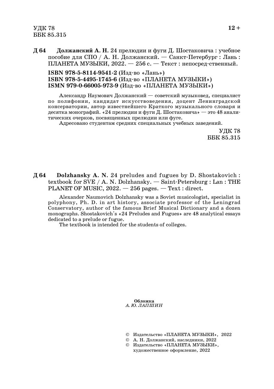 Alexander Naumovich Dolzhansky was a Soviet musicologist, specialist in polyphony, Ph. D. in art history, associate professor of the Leningrad Conservatory, author of the famous Brief Musical Dictionary and a dozen monographs. Shostakovich's «24 Preludes and Fugues» are 48 analytical essays dedicated to a prelude or fugue.