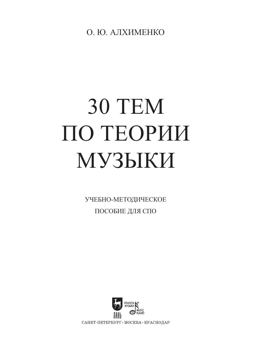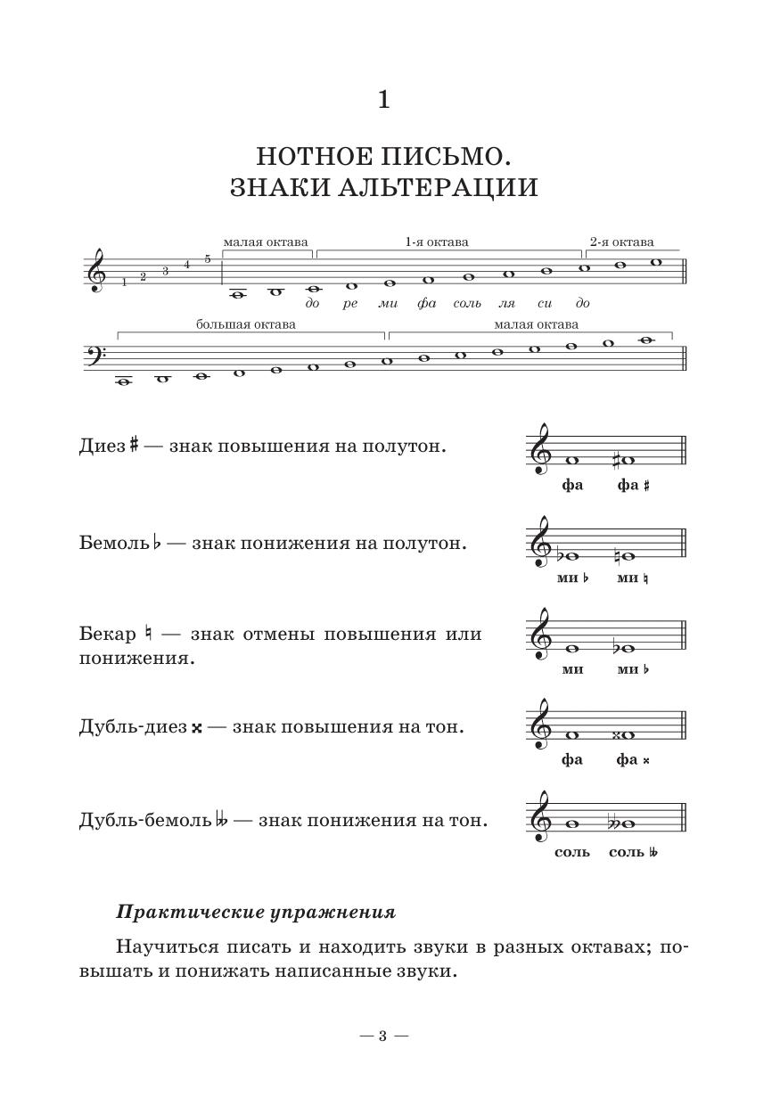 В пособии содержатся сведения об основных понятиях теории музыки: о строении интервалов, аккордов, ладов, особенностях метроритма, типах размеров и т.д. В отличие от традиционных учебников, добавлена тематика модуляции и отклонения. В силу специфики современного музыкального обучения, подробно изложена тема буквенной записи аккордов, т.к. это связано с необходимостью иметь в репертуаре актуальный музыкальный материал и уметь с ним работать. Учебное пособие по дисциплине «Элементарная теория музыки» соответствует современным требованиям Федерального государственного образовательного стандарта среднего профессионального образования и профессиональным квалификационным требованиями. Издание предназначено для студентов музыкальных специальностей средних профессиональных учебных заведений культуры и искусства, преподавателей музыкальных дисциплин, а также любителей музыки. The methodical textbook on elementary music theory contains information on the basic concepts of this subject: intervals structure and chords structure, modes, meter and rhythm features, types of music measures, etc. Also the topic of modulation is included. Due to the specifics of modern music education, the topic of letter notation of chords is presented in detail, since it is necessary to have relevant musical content in the repertoire and be able to work with it. The textbook on subject of elementary music theory corresponds to the modern re- quirements of the Federal State Educational Standard of Secondary Vocational Education and professional qualification requirements. The textbook is intended for music students of culture and arts colleges, teachers of music subjects, as well as music lovers.
