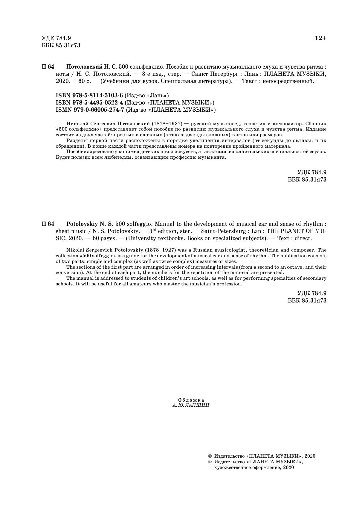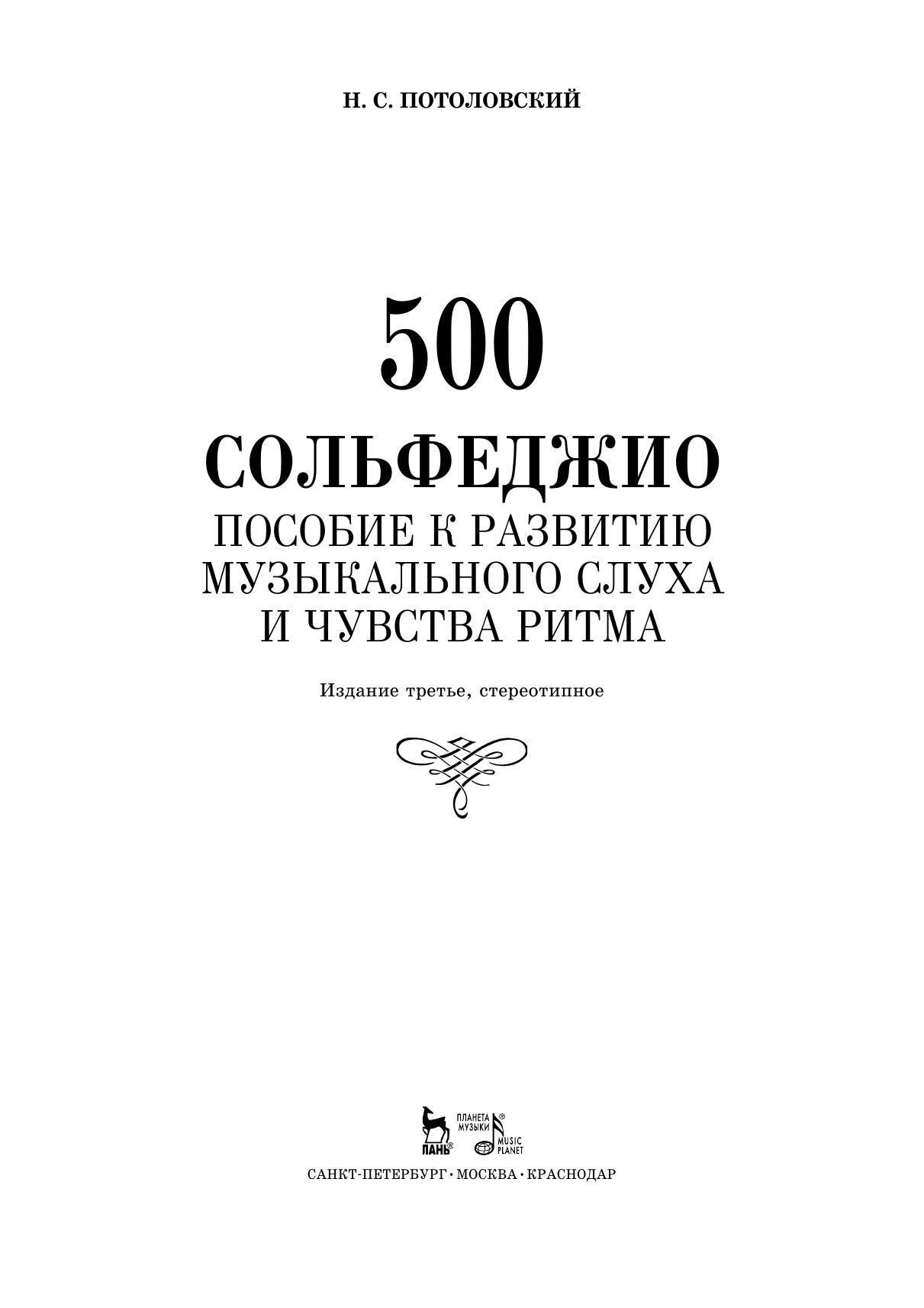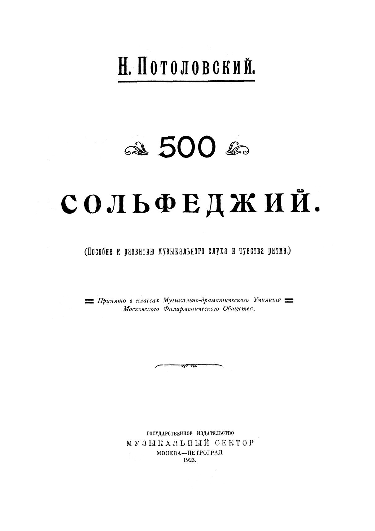 Николай Сергеевич Потоловский (1878–1927) — русский музыковед, теоретик и композитор. Сборник «500 сольфеджио» представляет собой пособие по развитию музыкального слуха и чувства ритма. Издание состоит из двух частей: простых и сложных (а также дважды сложных) тактов или размеров.