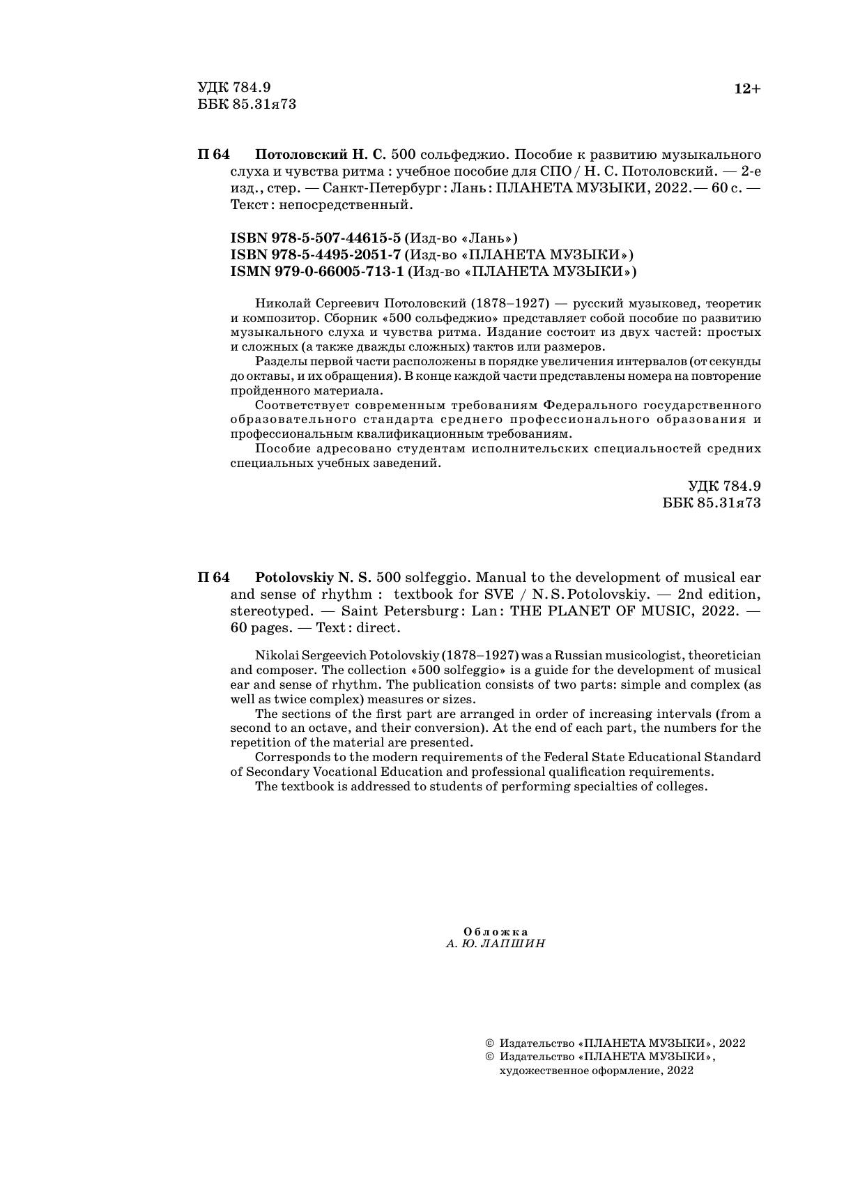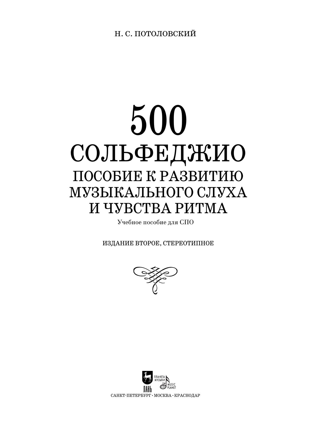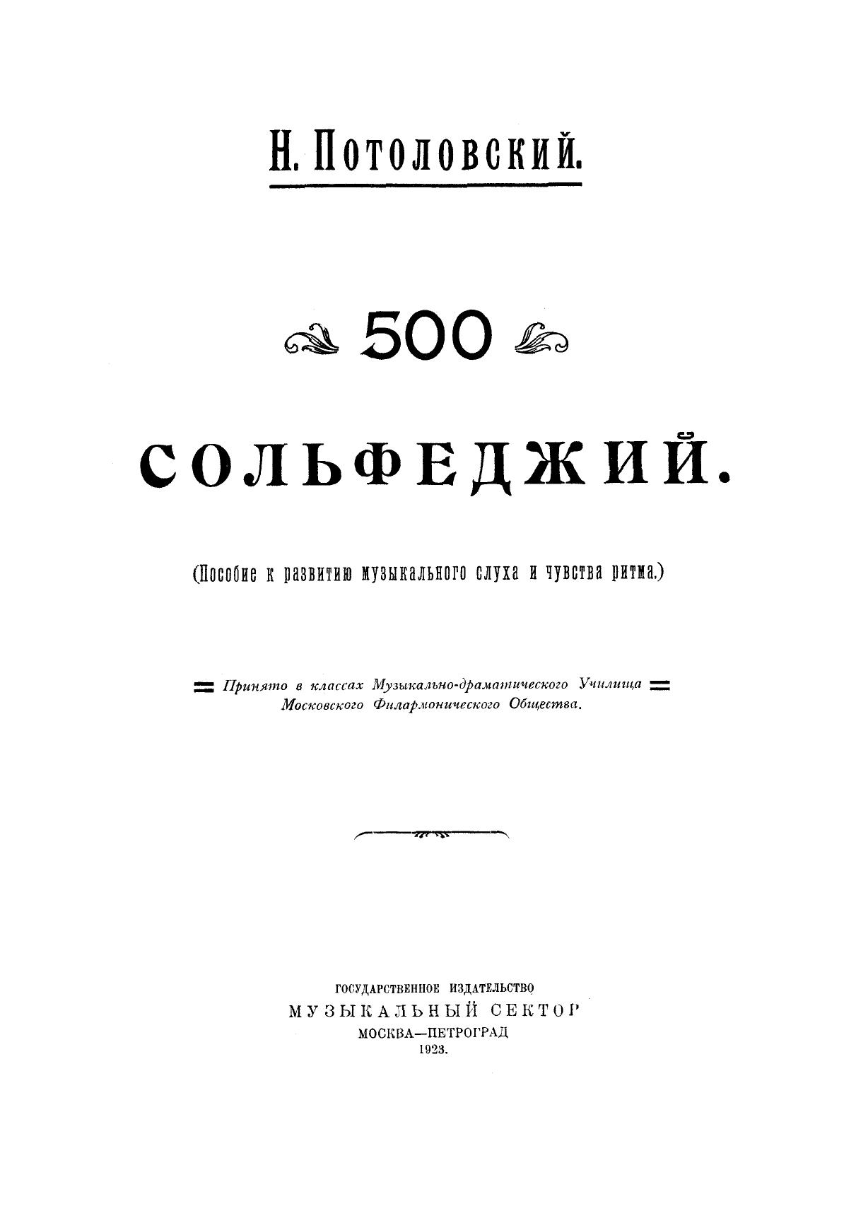 Nikolai Sergeevich Potolovskiy (1878–1927) was a Russian musicologist, theoretician and composer. The collection «500 solfeggio» is a guide for the development of musical ear and sense of rhythm. The publication consists of two parts: simple and complex (as well as twice complex) measures or sizes.