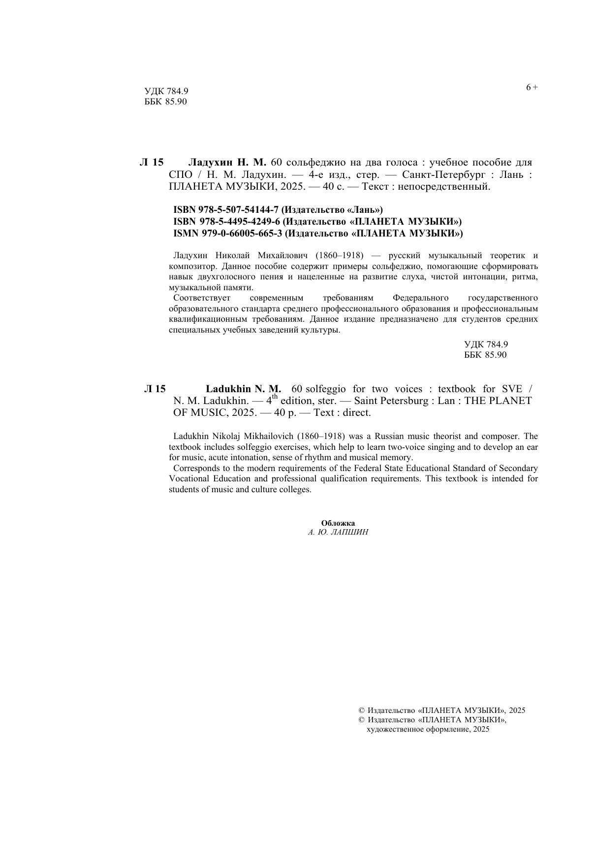 Ладухин Николай Михайлович (1860 – 1918) – русский музыкальный теоретик и композитор. Данное пособие содержит примеры сольфеджио, помогающие сформировать навык двухголосного пения и нацеленные на развитие слуха, чистой интонации, ритма, музыкальной памяти. Данное издание предназначено для студентов средних специальных учебных заведений культуры. Ladukhin Nikolaj Mikhailovich (1860 – 1918) was a Russian music theorist and composer. The textbook includes solfeggio exercises, that help to learn two-voice singing and to develop an ear for music, acute intonation, sense of rhythm and musical memory. This textbook is intended for students of music and culture colleges.