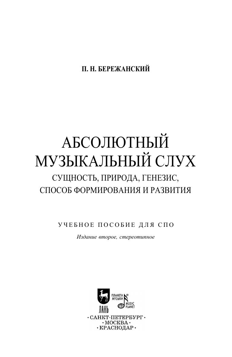 В данной книге дано научное объяснение феномена абсолютного слуха. Анализ результатов ранее проводившихся исследований и собственная теоретическая и экспериментальная работа автора привели к разработке эффективного способа формирования и развития этой ценной, считавшейся врожденной музыкальной способности. Книга адресована педагогам и студентам средних специальных учебных заведений, а также всем интересующимся вопросами психологии музыкальных способностей. In this book a scientific explanation of the phenomenon of absolute hearing is given. The analysis of the results of previous studies and the author's own theoretical and experimental work led to the development of an effective method for the formation and development of this valuable, considered innate, musical ability. The book is addressed to teachers and students of colleges, as well as all those interested in psychology of musical abilities.