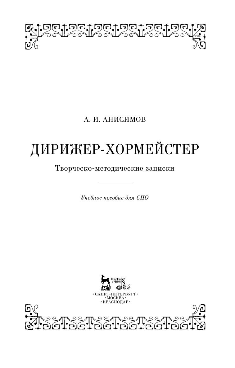 Анисимов А. И. (1905-1976) рассматривает в книге такие вопросы, как комплектование хоровых партий, посадка на репетициях, расстановка на концерте; технология работы с хором: элементы хоровой звучности, чистота интонирования, строй; мануальная техника и идейно-художественное содержание хоровых партитур.