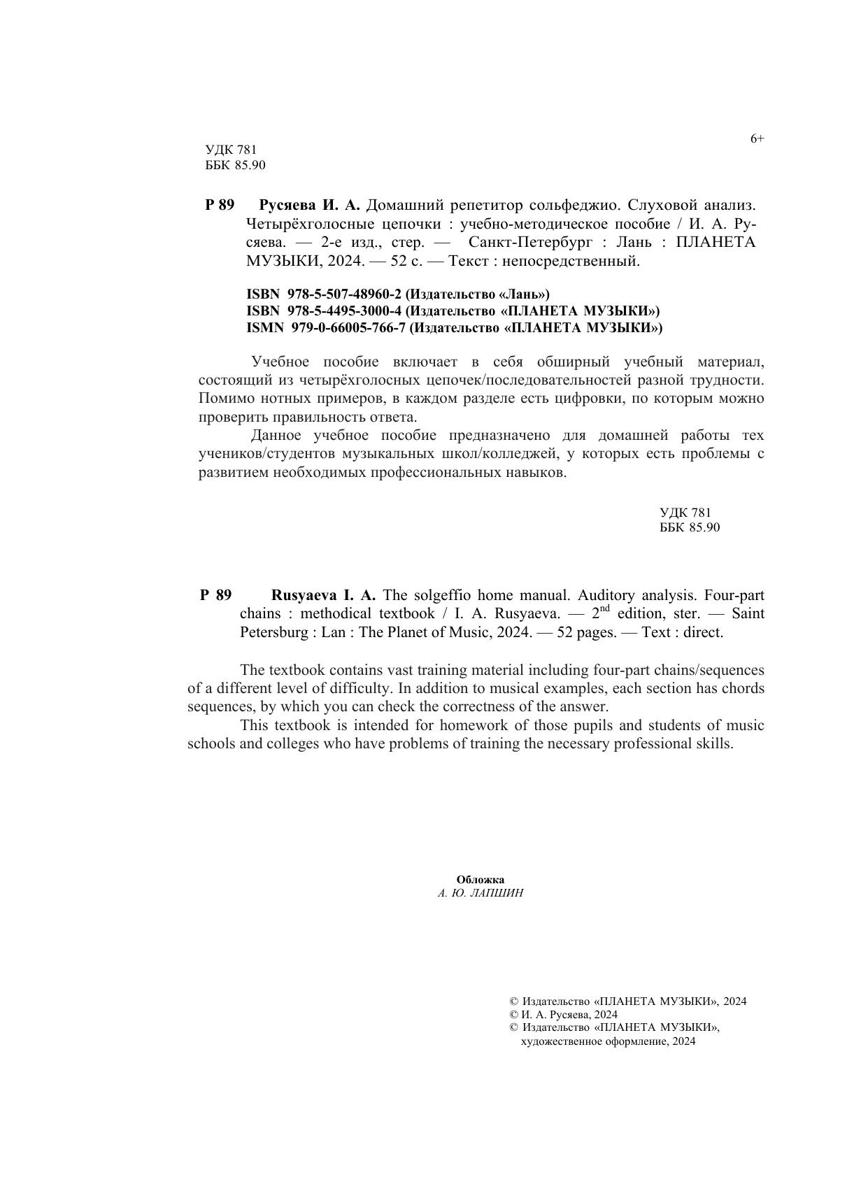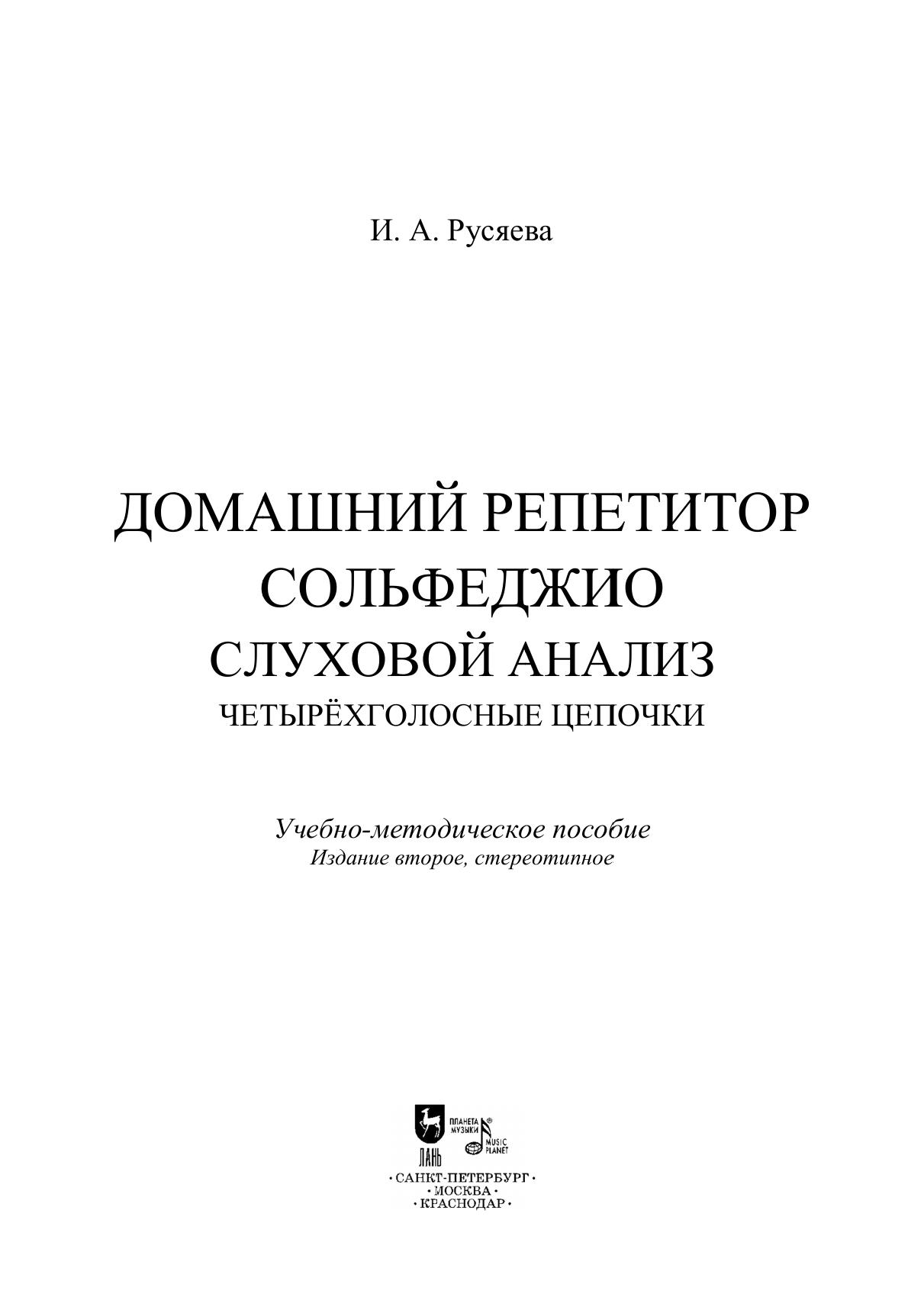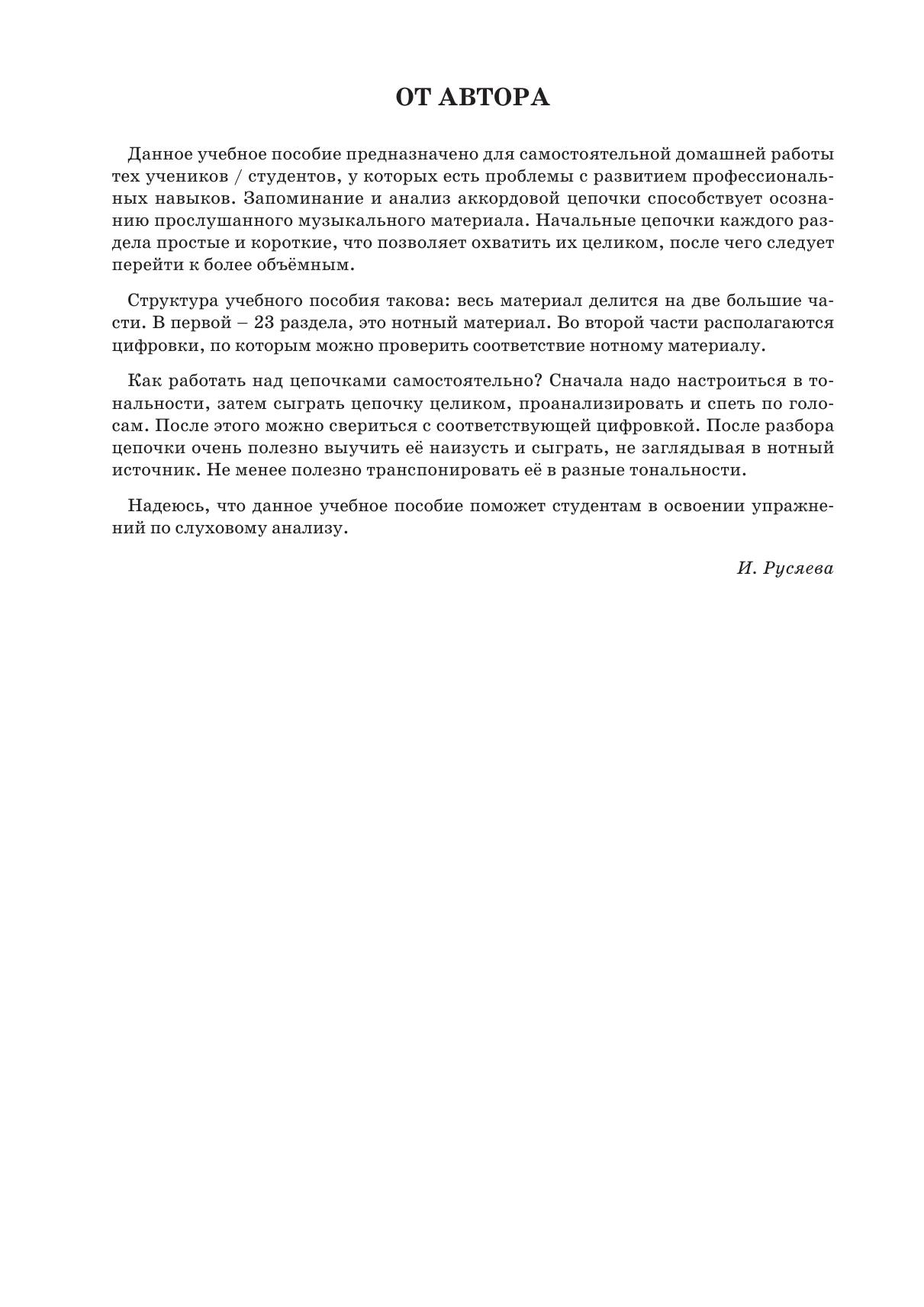 Учебное пособие включает в себя обширный учебный материал, состоящий из четырёхголосных цепочек/последовательностей разной трудности. Помимо нотных примеров, в каждом разделе есть цифровки, по которым можно проверить правильность ответа. Данное учебное пособие предназначено для домашней работы тех учеников/студентов музыкальных школ/колледжей, у которых есть проблемы с развитием необходимых профессиональных навыков. The textbook contains vast training material including four-part chains/sequences of a different level of difficulty. In addition to musical examples, each section has chords sequences, by which you can check the correctness of the answer. This textbook is intended for homework of those pupils and students of music schools and colleges who have problems of training the necessary professional skills.