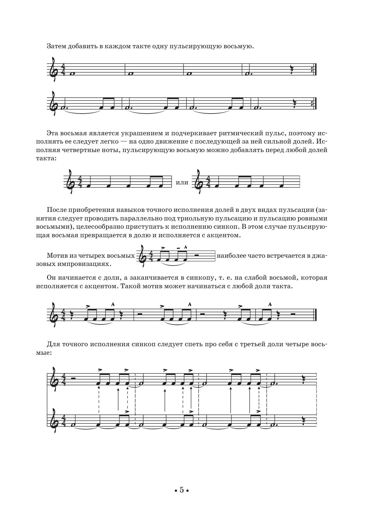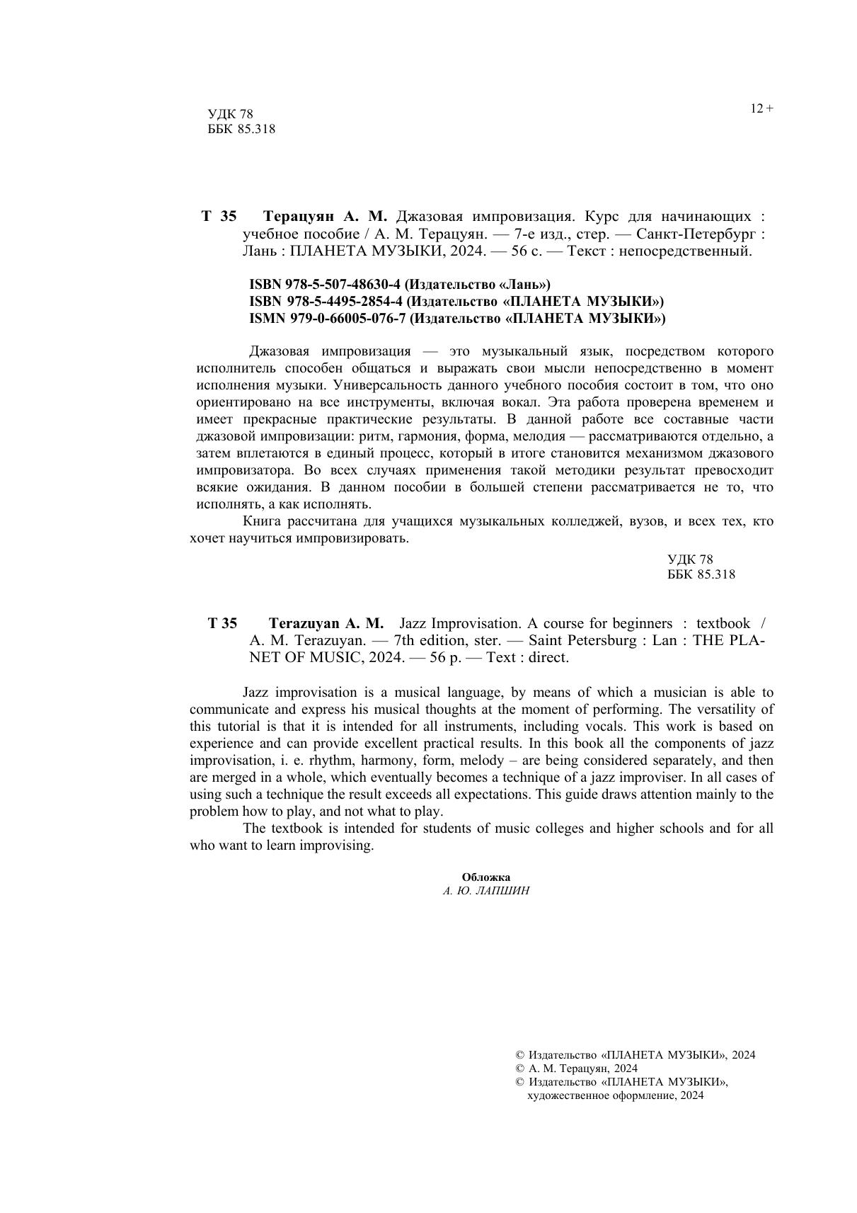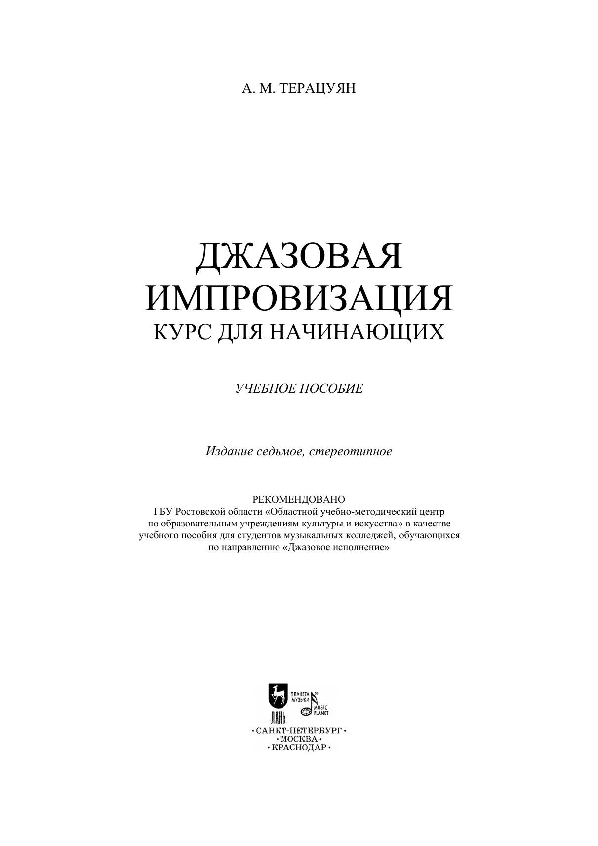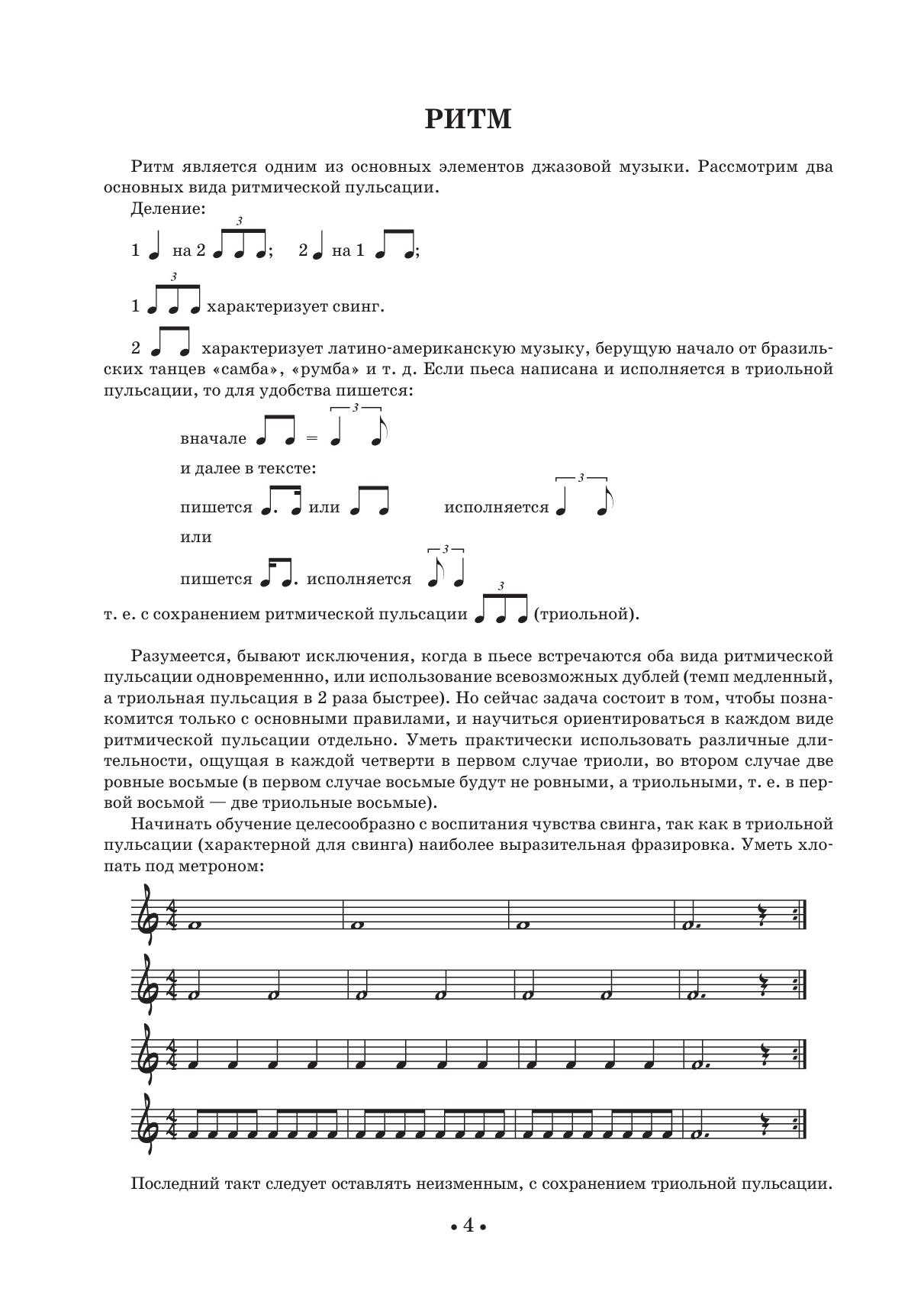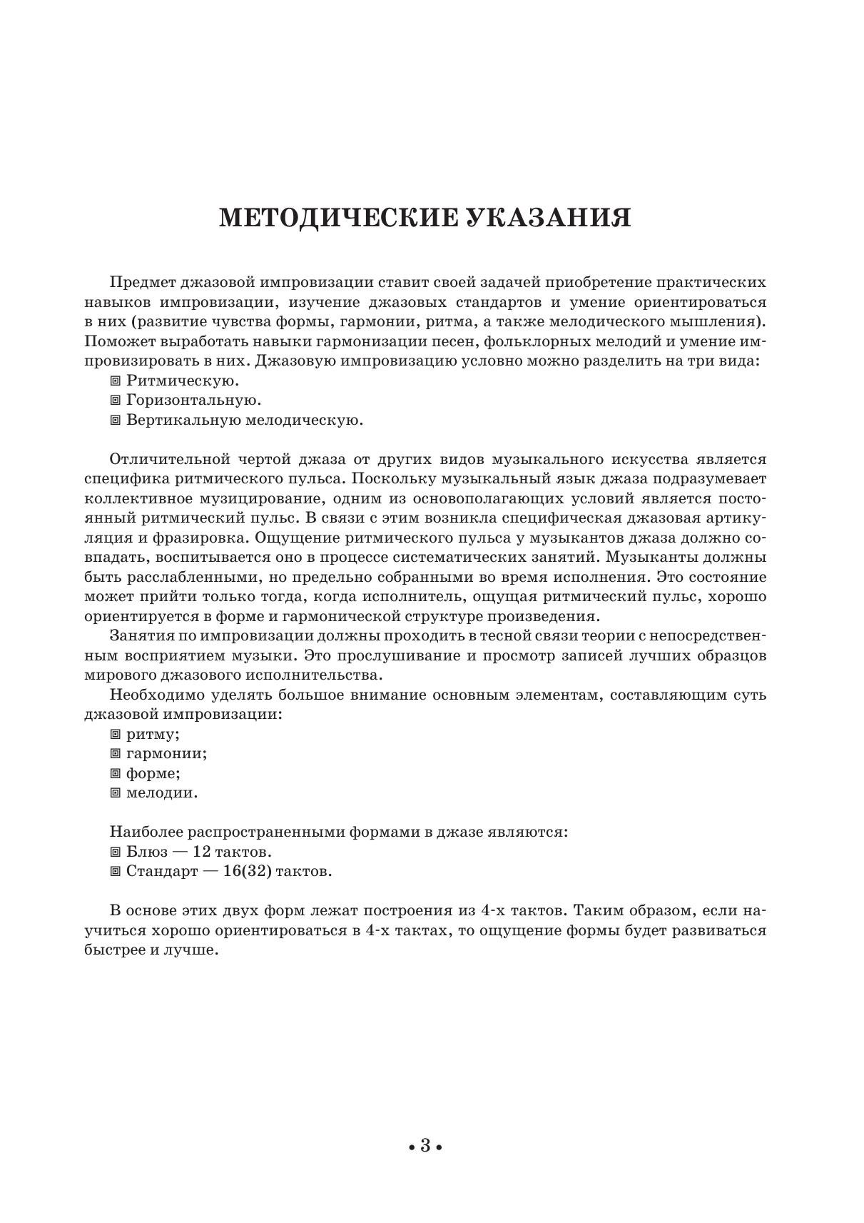 Джазовая импровизация — это музыкальный язык, посредством которого исполнитель способен общаться и выражать свои мысли непосредственно в момент исполнения музыки. Универсальность данного учебного пособия состоит в том, что оно ориентировано на все инструменты, включая вокал. Эта работа проверена временем и имеет прекрасные практические результаты. В данной работе все составные части джазовой импровизации: ритм, гармония, форма, мелодия — рассматриваются отдельно, а затем вплетаются в единый процесс, который в итоге становится механизмом джазового импровизатора. Во всех случаях применения такой методики результат превосходит всякие ожидания. В данном пособии в большей степени рассматривается не то, что исполнять, а как исполнять. Книга рассчитана для учащихся музыкальных колледжей, вузов, и всех тех, кто хочет научиться импровизировать. Jazz improvisation is a musical language, by means of which a musician is able to communicate and express his musical thoughts at the moment of performing. The versatility of this tutorial is that it is intended for all instruments, including vocals. This work is based on experience and can provide excellent practical results. In this book all the components of jazz improvisation, i.e. rhythm, harmony, form, melody – are being considered separately, and then are merged in a whole, which eventually becomes a technique of a jazz improviser. In all cases of using such a technique the result exceeds all expectations. This manual draws attention mainly to the problem how to play, and not what to play. The textbook is intended for students of musical colleges and high schools and for all who want to learn improvising.
