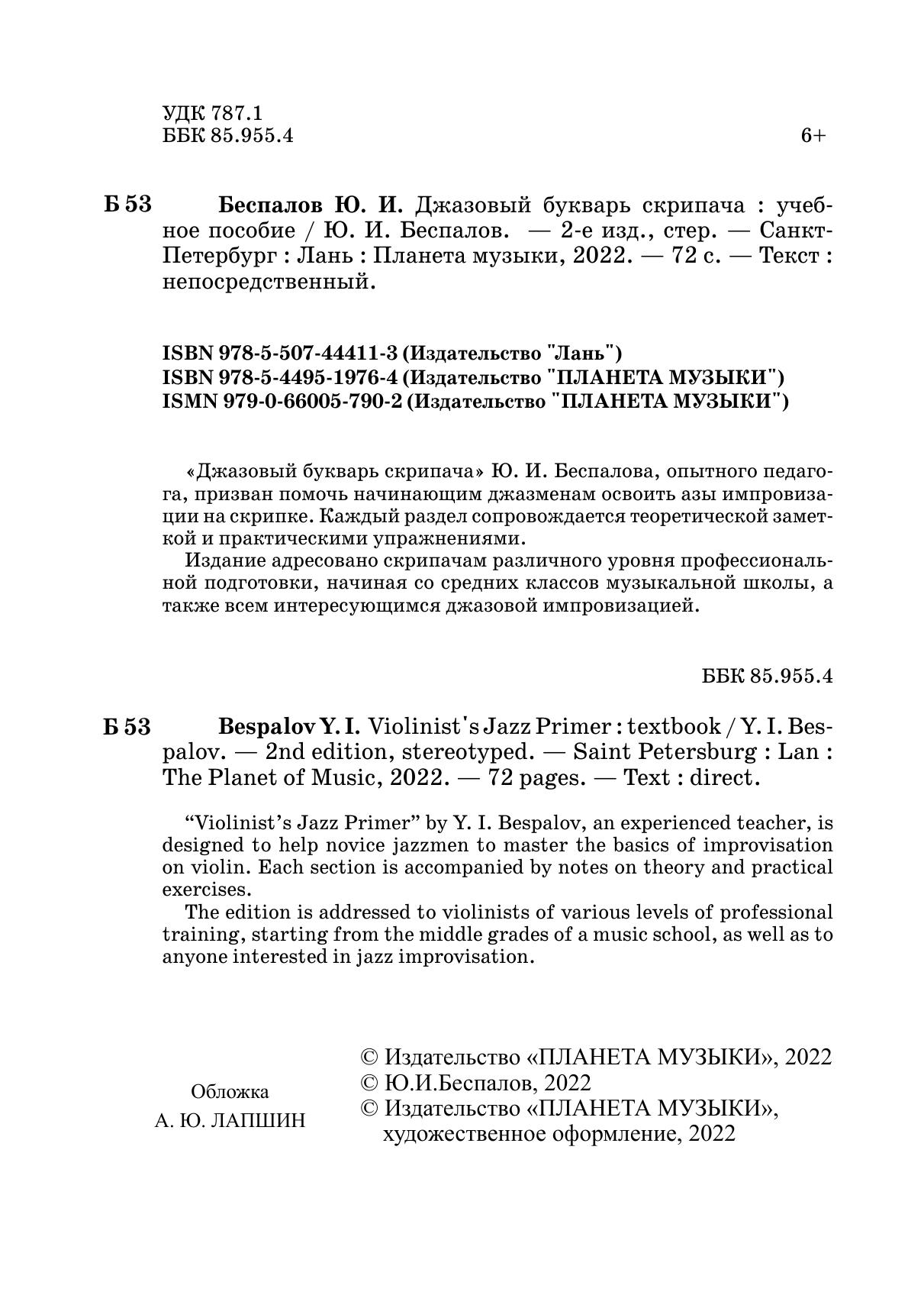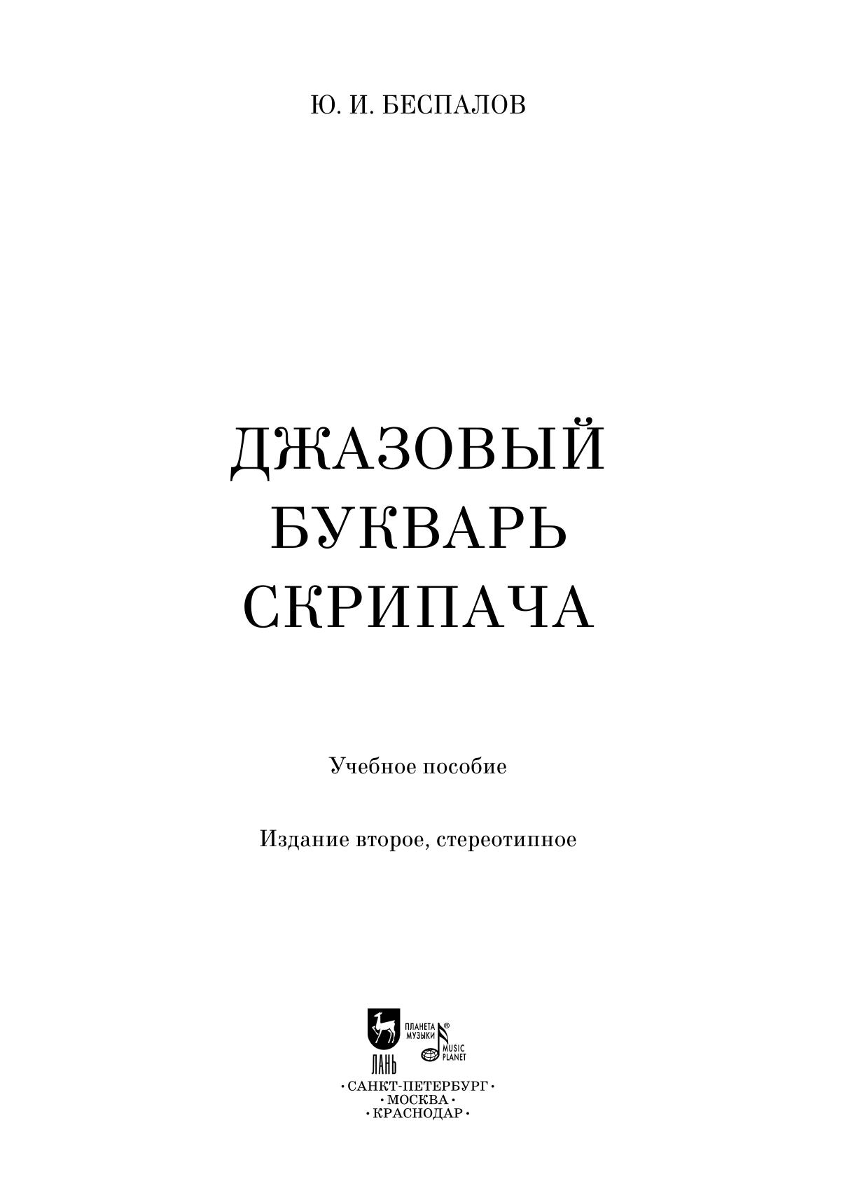 «Джазовый букварь скрипача» Ю. И. Беспалова, опытного педагога, призван помочь начинающим джазменам освоить азы импровизации на скрипке. Каждый раздел сопровождается теоретической заметкой и практическими упражнениями.