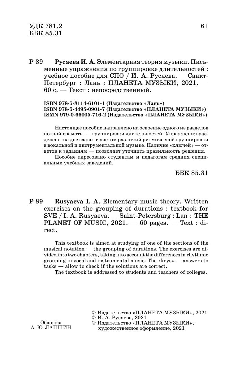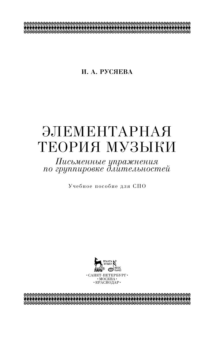 Настоящее пособие направлено на освоение одного из разделов нотной грамоты — группировки длительностей. Упражнения разделены на две главы с учетом различий ритмической группировки в вокальной и инструментальной музыке. Наличие «ключей» — ответов к заданиям — позволяет уточнить правильность решения. Пособие адресовано студентам и педагогам средних специальных учебных заведений.