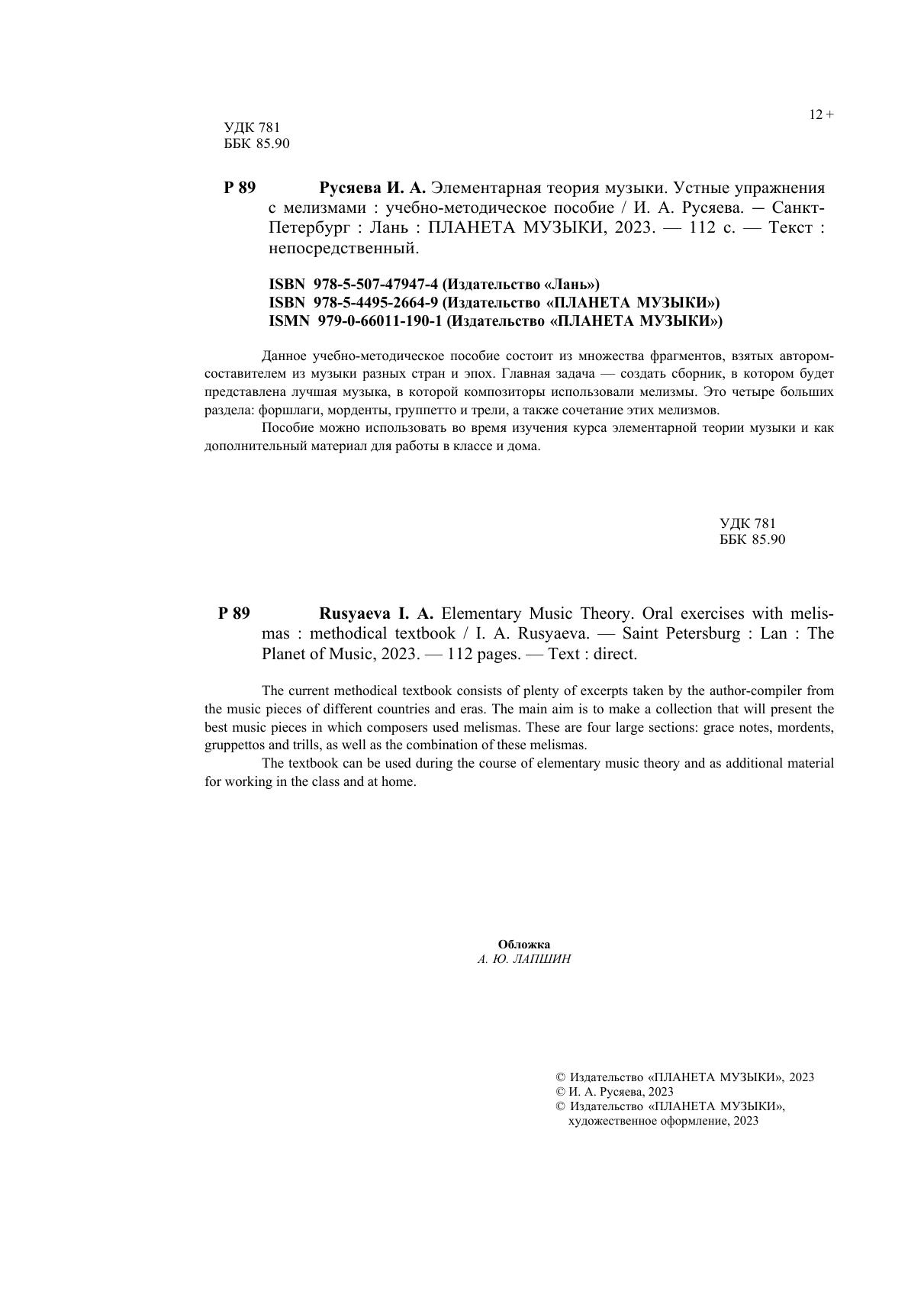 Данное учебно-методическое пособие состоит из множества фрагментов, взятых автором-составителем из музыки разных стран и эпох. Главная задача — создать сборник, в котором будет представлена лучшая музыка, в которой композиторы использовали мелизмы. Это 4 больших раздела: форшлаги, морденты, группетто и трели, а также сочетание этих мелизмов. Пособие можно использовать во время изучения курса элементарной теории музыки и как дополнительный материал для работы в классе и дома. The сurrent methodical textbook consists of plenty of excerpts taken by the author-compiler from the music pieces of different countries and eras. The main aim is to make a collection that will present the best music pieces in which composers used melismas. These are four large sections: grace notes, mordents, gruppettos and trills, as well as the combination of these melismas. The textbook can be used during the course of elementary music theory and as additional material for working in the class and at home.