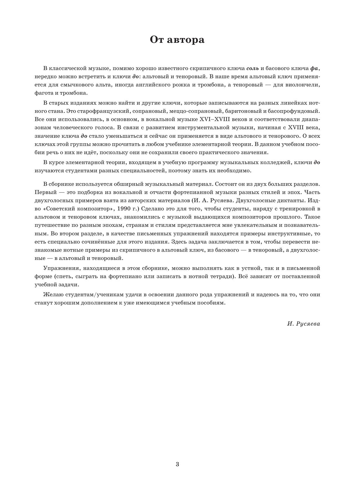 Учебно-методическое пособие состоит из большого количества примеров, взятых из музыки различных стран и эпох – начиная с барокко и включая музыку лучших представителей XX века. Все примеры специально переведены из скрипичного и басового ключей в альтовый и теноровый. Это сделано в учебных целях. Сборник делится на два больших раздела: в первом находятся одноголосные и двухголосные примеры из музыкальной литературы. Во втором – авторские, специально сочинённые, примеры для обратного перевода: из скрипичного – в альтовый ключ, из басового – в теноровый. Двухголосие соответственно – из скрипичного и басового в альтовый и теноровый. Упражнения можно выполнять как в устной форме (спеть или сыграть), так и в письменной. Всё зависит от поставленной учебной задачи. Предназначается учебно-методическое пособие для тренировки и закрепления навыков во время изучения курса элементарной теории музыки.