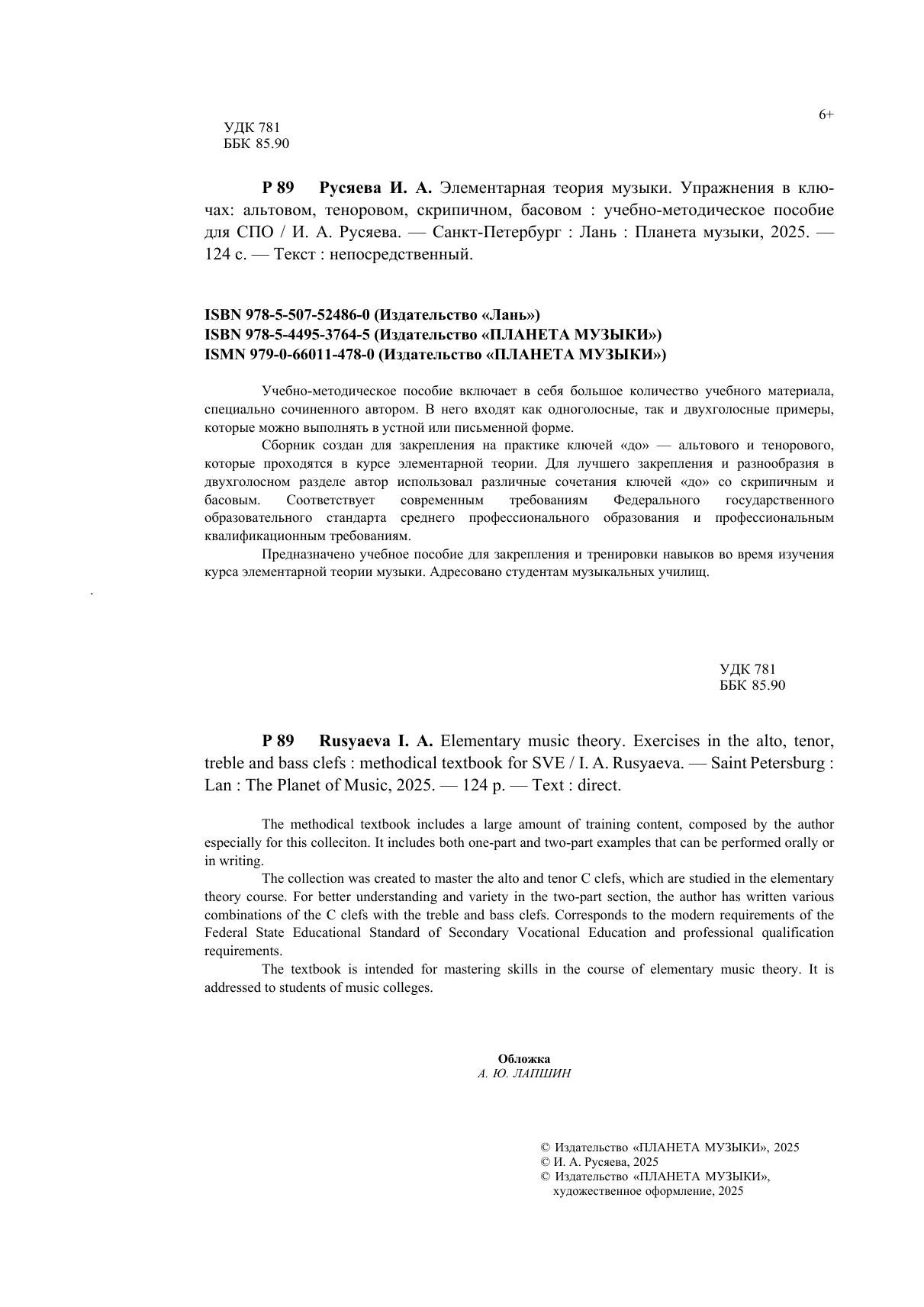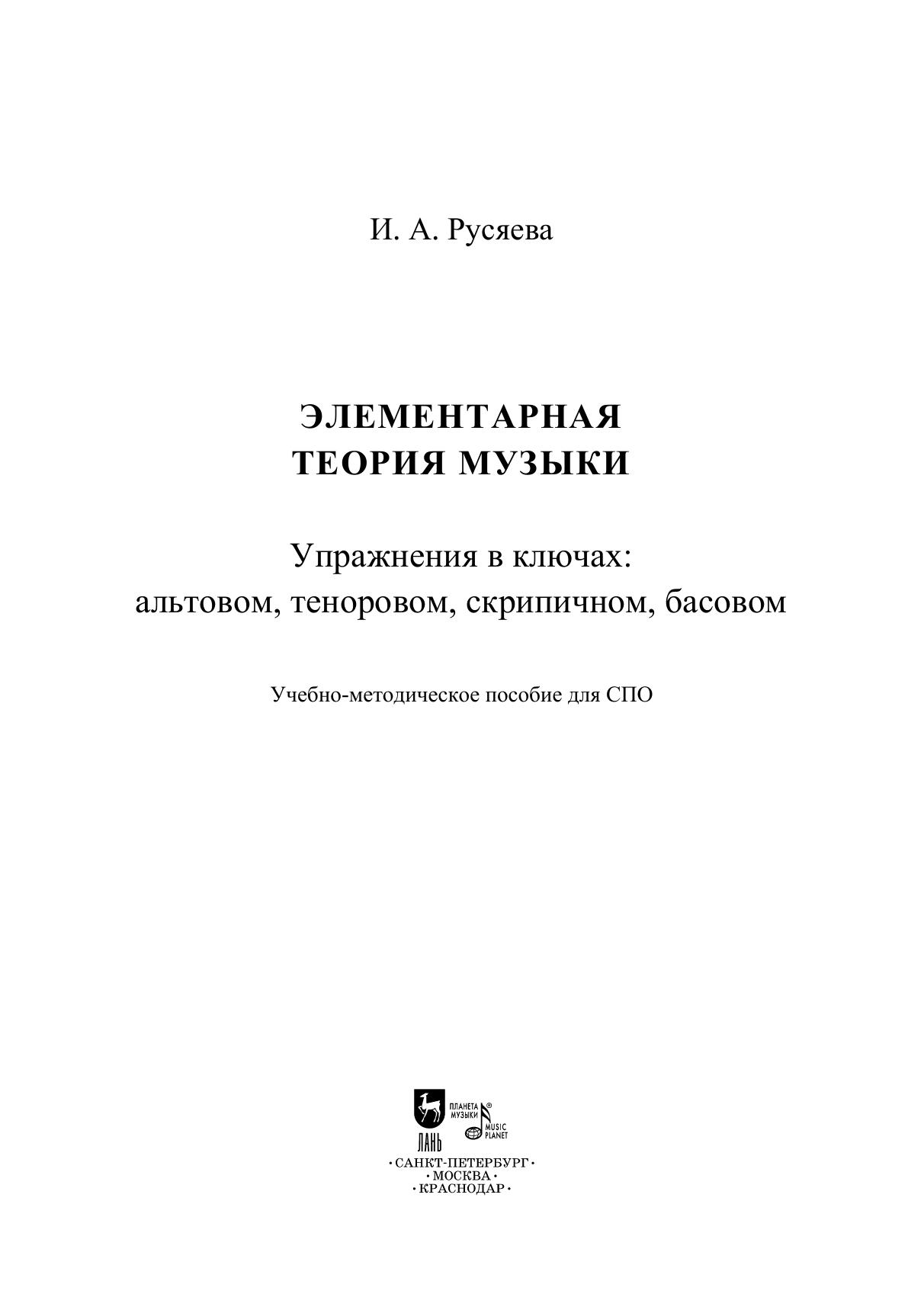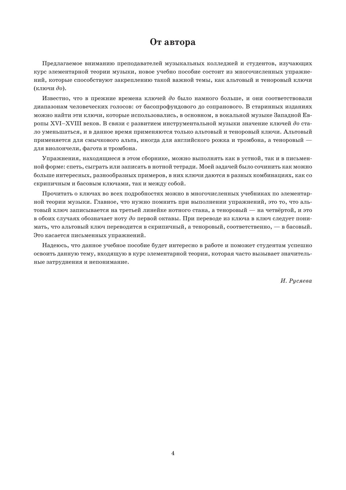 Учебно-методическое пособие включает в себя большое количество учебного материала, специально сочинённое автором. В него входят как одноголосные, так и двухголосные примеры, которые можно выполнять в устной или письменной форме. Сборник создан для закрепления на практике ключей «до» - альтового и тенорового, которые проходятся в курсе элементарной теории. Для лучшего закрепления и разнообразия в двухголосном разделе автор использовал различные сочетания ключей «до» со скрипичным и басовым. Соответствует современным требованиям Федерального государственного образовательного стандарта среднего профессионального образования и профессиональным квалификационным требованиям. Предназначено учебное пособие для закрепления и тренировки навыков во время изучения курса элементарной теории музыки. The methodical textbook includes a large amount of training content, composed by the author especially for this colleciton. It includes both one-part and two-part examples that can be performed orally or in writing. The collection was created to master the alto and tenor C clefs, which are studied in the elementary theory course. For better understanding and variety in the two-part section, the author has written various combinations of the C clefs with the treble and bass clefs. Corresponds to the modern requirements of the Federal State Educational Standard of Secondary Vocational Education and professional qualification requirements. The textbook is intended for mastering skills in the course of elementary music theory. It is addressed to students of music colleges.