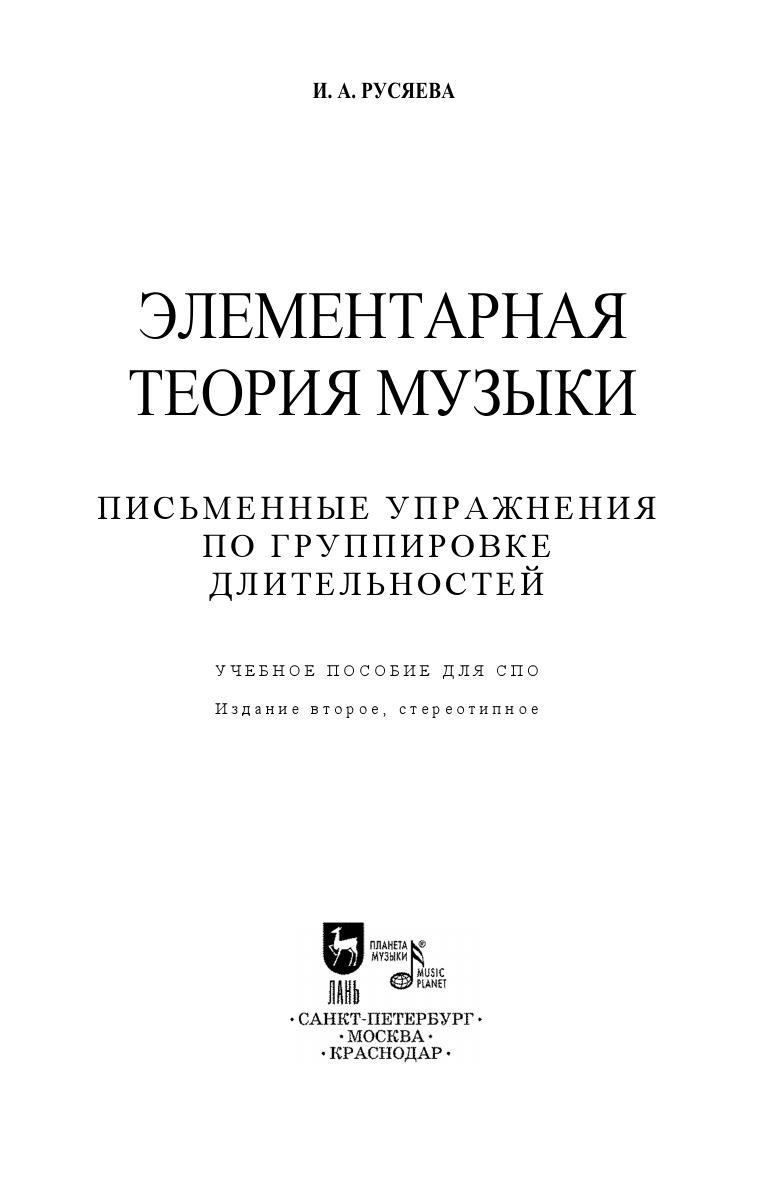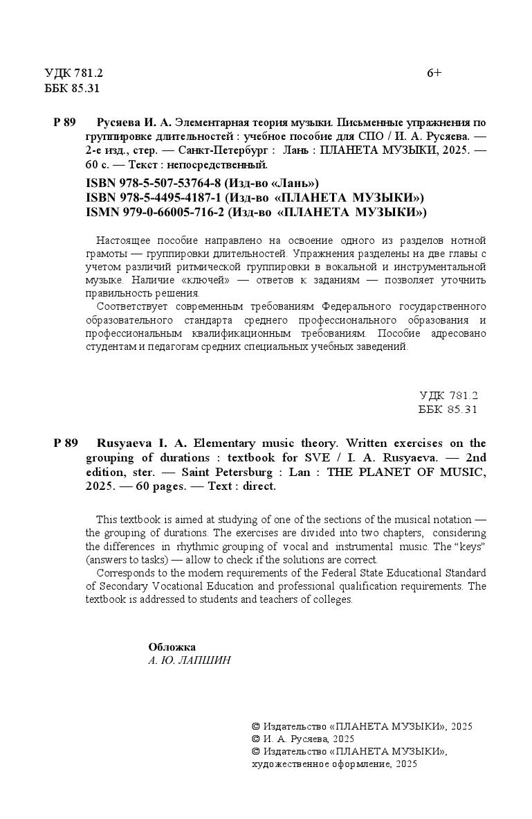 Настоящее пособие направлено на освоение одного из разделов нотной грамоты — группировки длительностей. Упражнения разделены на две главы с учетом различий ритмической группировки в вокальной и инструментальной музыке. Наличие «ключей» — ответов к заданиям — позволяет уточнить правильность решения. Пособие адресовано студентам и педагогам средних специальных учебных заведений. This textbook is aimed at studying of one of the sections of the musical notation – the grouping of durations. The exercises are divided into two chapters, taking into account the differences in rhythmic grouping in vocal and instrumental music. The "keys" - answers to tasks - allow to check if the solutions are correct. The textbook is addressed to students and teachers of colleges.