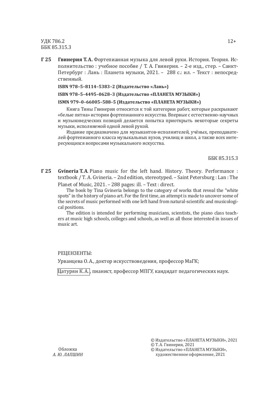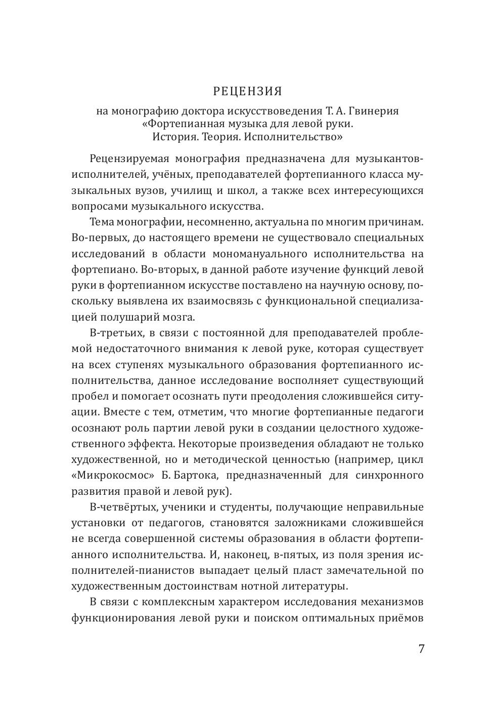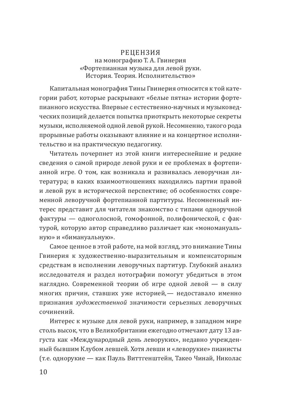 Книга Тины Гвинерия относится к той категории работ, которые раскрывают «белые пятна» истории фортепианного искусства. Впервые с естественно-научных и музыковедческих позиций делается попытка приоткрыть некоторые секреты музыки, исполняемой одной левой рукой.