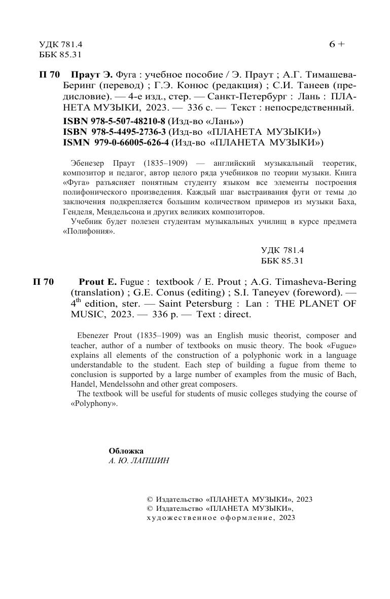 Эбенезер Праут (1835-1909) – английский музыкальный теоретик, композитор и педагог, автор целого ряда учебников по теории музыки. Книга «Фуга» разъясняет понятным студенту языком все элементы построения полифонического произведения. Каждый шаг выстраивания фуги от темы до заключения подкрепляется большим количеством примеров из музыки Баха, Генделя, Мендельсона и других великих композиторов. Учебник будет полезен студентам музыкальных училищ в курсе предмета «Полифония». Ebenezer Prout (1835–1909) was an English music theorist, composer and teacher, author of a number of textbooks on music theory. The book "Fugue" explains all elements of the construction of a polyphonic work in a language understandable to the student. Each step of building a fugue from theme to conclusion is supported by a large number of examples from the music of Bach, Handel, Mendelssohn and other great composers. The textbook will be useful for students of music colleges studying the course of "Polyphony".