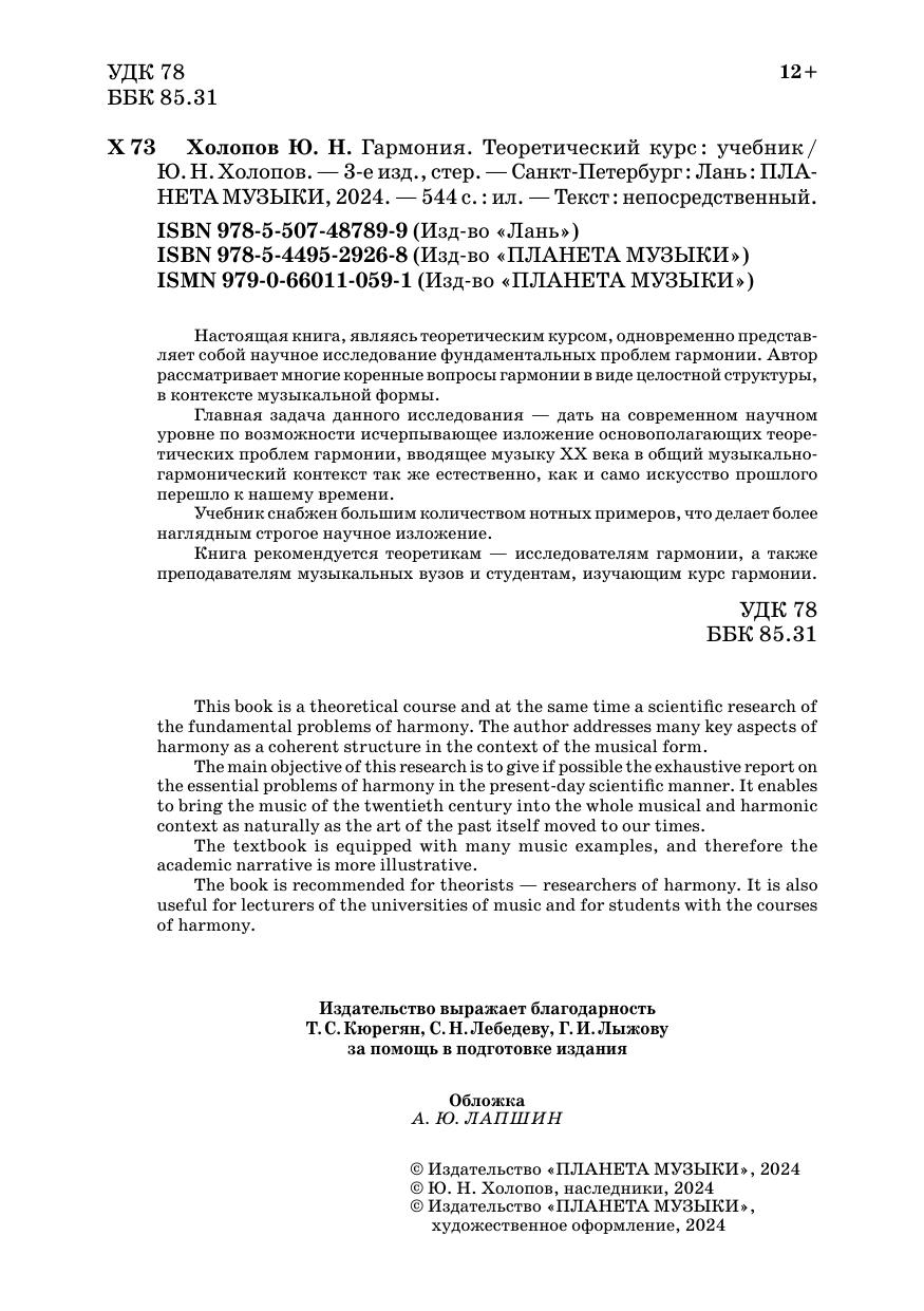 Настоящая книга, являясь теоретическим курсом, одновременно представляет собой научное исследование фундаментальных проблем гармонии. Автор рассматривает многие коренные вопросы гармонии в виде целостной структуры, в контексте музыкальной формы. Главная задача данного исследования— дать на современном научном уровне по возможности исчерпывающее изложение основополагающих теоретических проблем гармонии, вводящее музыку XX века в общий музыкально-гармонический контекст так же естественно, как и само искусство прошлого перешло к нашему времени. Учебник снабжен большим количеством нотных примеров, что делает более наглядным строгое научное изложение. Книга рекомендуется теоретикам — исследователям гармонии, а также преподавателям музыкальных вузов и студентам, изучающим курс гармонии.