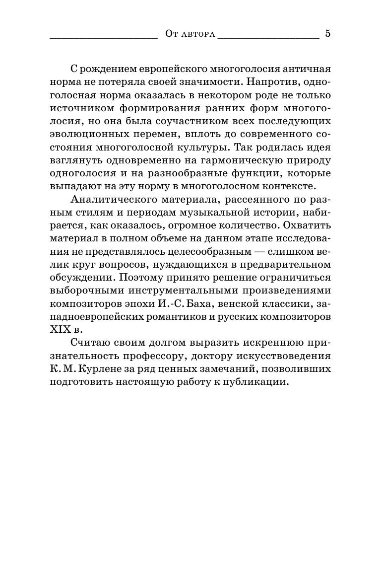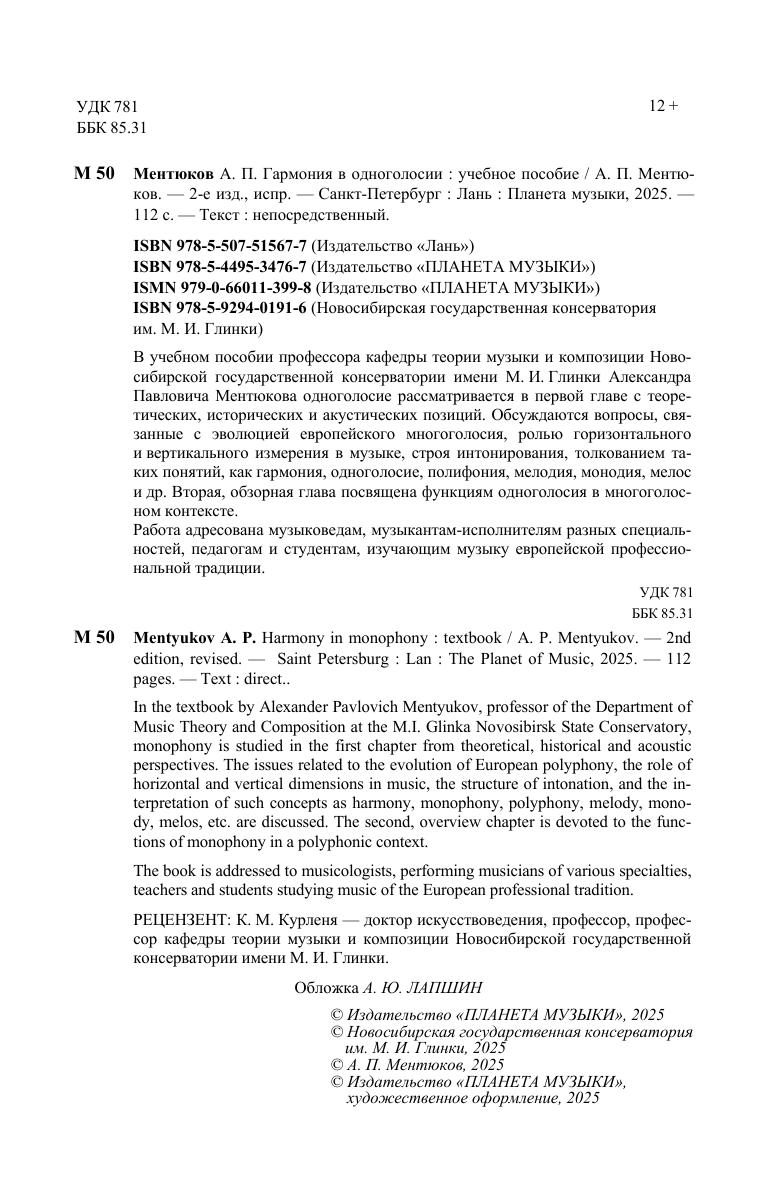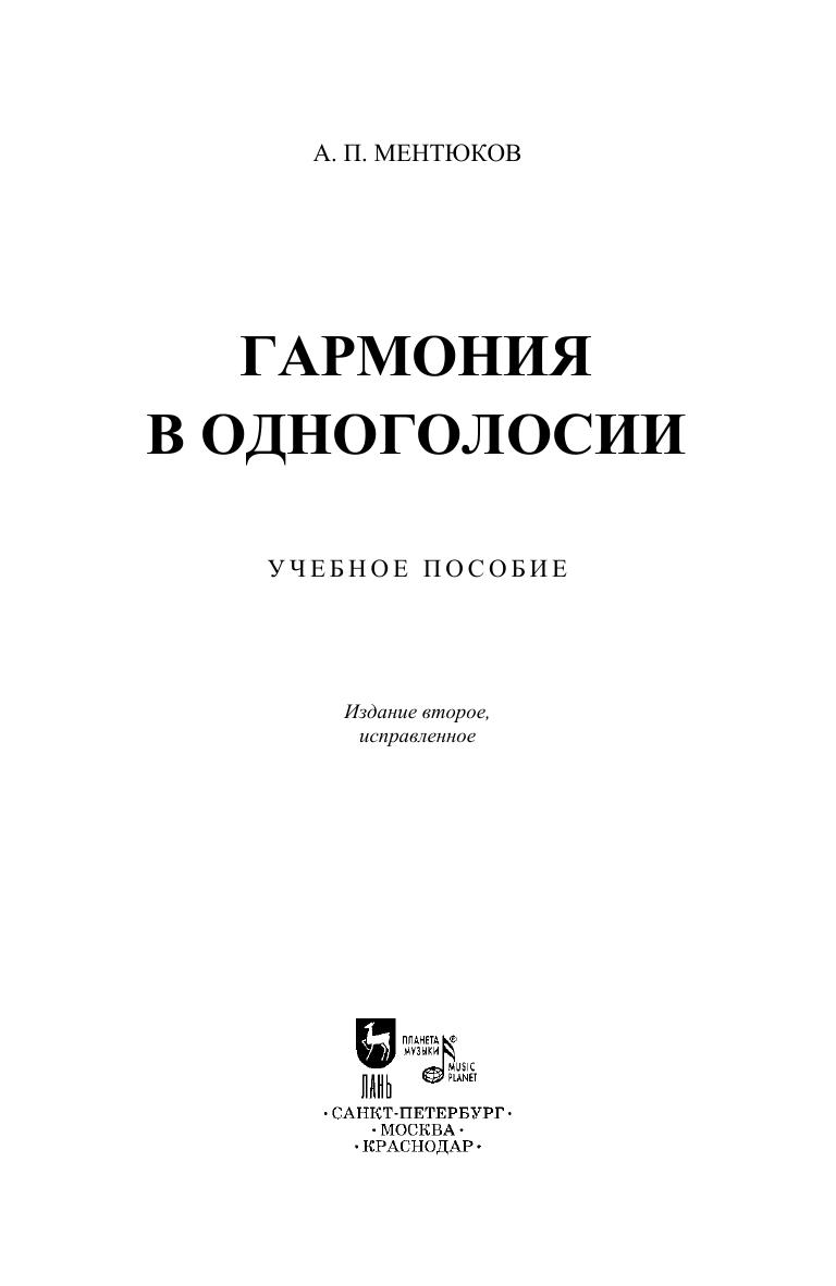 В учебном пособии профессора кафедры теории музыки и композиции Новосибирской государственной консерватории имени М.И. Глинки Александра Павловича Ментюкова одноголосие рассматривается в первой главе с теоретических, исторических и акустических позиций. Обсуждаются вопросы, связанные с эволюцией европейского многоголосия, ролью горизонтального и вертикального измерения в музыке, строя интонирования, толкованием таких понятий, как гармония, одноголосие, полифония, мелодия, монодия, мелос и др. Вторая, обзорная глава посвящена функциям одноголосия в многоголосном контексте. Работа адресована музыковедам, музыкантам-исполнителям разных специальностей, педагогам и студентам, изучающим музыку европейской профессиональной традиции. In the textbook by Alexander Pavlovich Mentyukov, professor of the Department of Music Theory and Composition at the M.I. Glinka Novosibirsk State Conservatory, monophony is studied in the first chapter from theoretical, historical and acoustic perspectives. The issues related to the evolution of European polyphony, the role of horizontal and vertical dimensions in music, the structure of intonation, and the interpretation of such concepts as harmony, monophony, polyphony, melody, monody, melos, etc. are discussed. The second, overview chapter is devoted to the functions of monophony in a polyphonic context. The book is addressed to musicologists, performing musicians of various specialties, teachers and students studying music of the European professional tradition.
