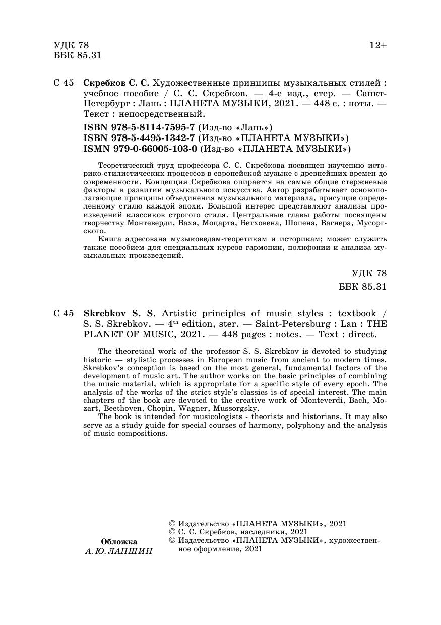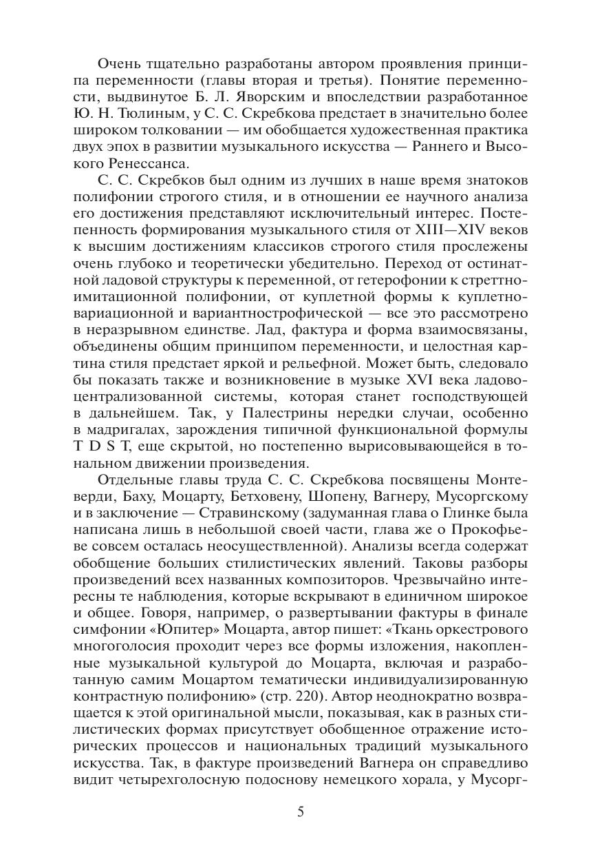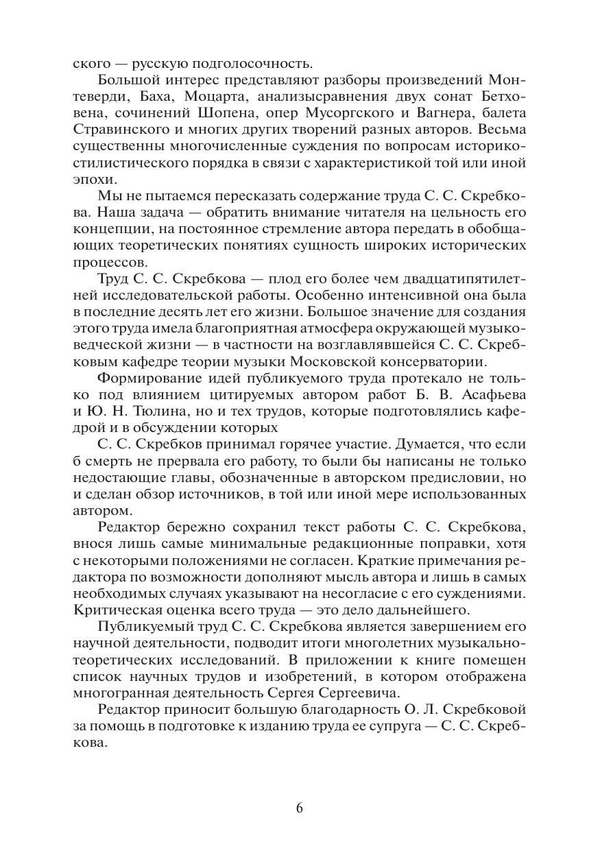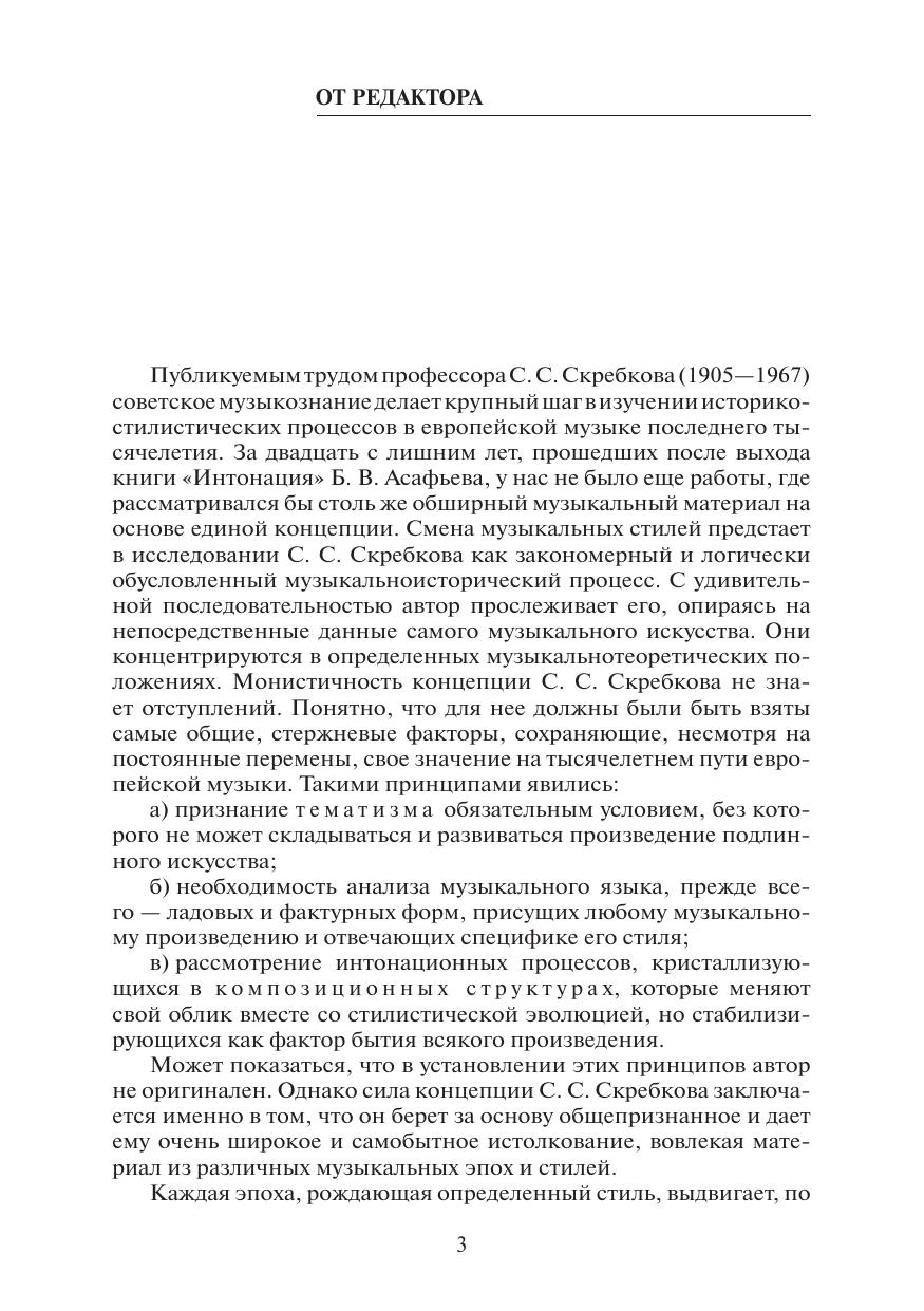 Теоретический труд профессора С. С. Скребкова посвящен изучению историко-стилистических процессов в европейской музыке с древнейших времен до современности. Концепция Скребкова опирается на самые общие. Стержневые факторы в развитии музыкального искусства. Автор разрабатывает основополагающие принципы объединения музыкального материала, присущие определенному стилю каждой эпохи. Большой интерес представляют анализы произведений классиков строгого стиля. Центральные главы работы посвящены творчеству Монтеверди, Баха, Моцарта, Бетховена, Шопена, Вагнера, Мусоргского. Книга адресована музыковедам-теоретикам и историкам; может служить также пособием для специальных курсов гармонии, полифонии и анализа музыкальных произведений.