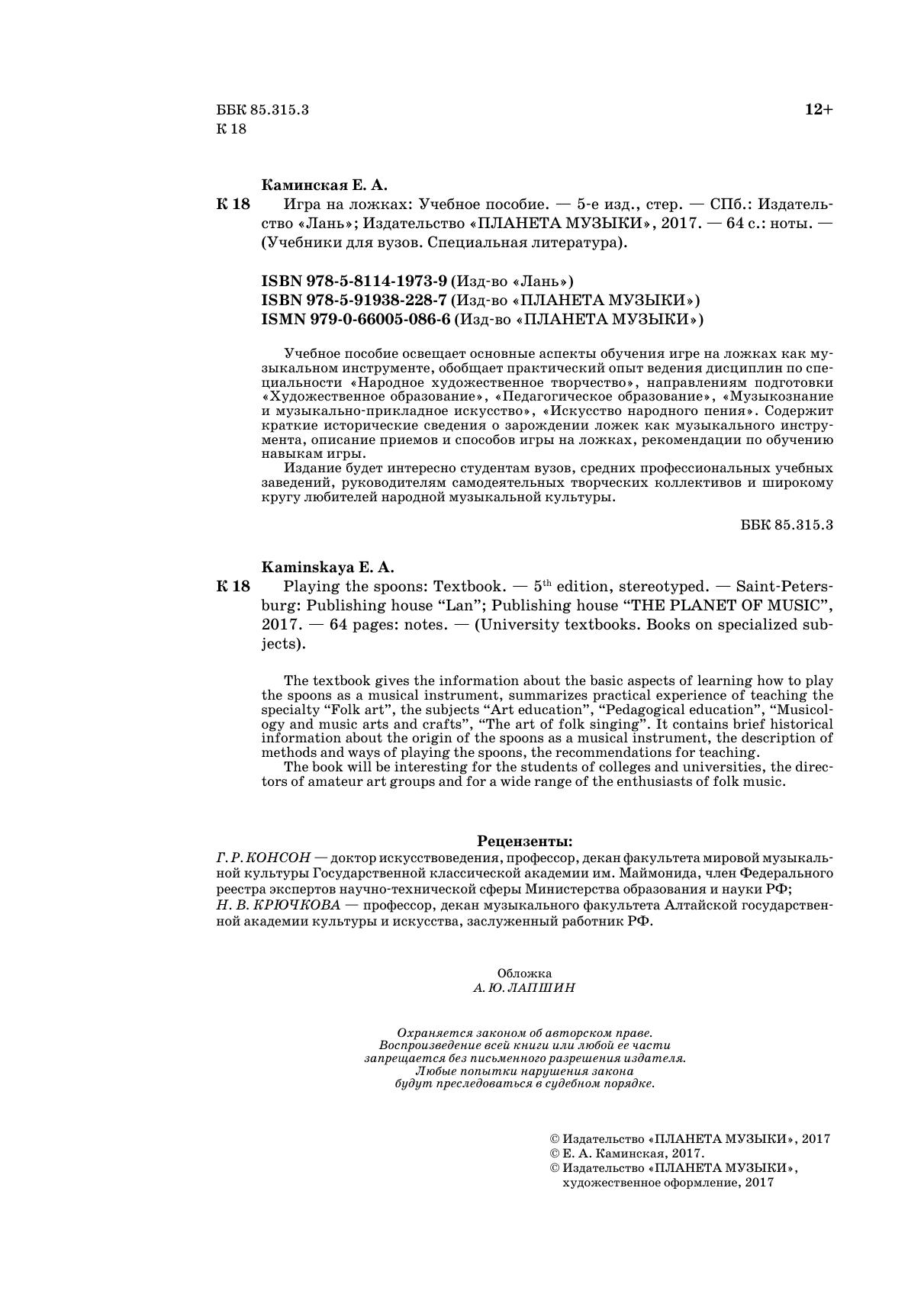Учебное пособие освещает основные аспекты обучения игре на ложках как музыкальном инструменте, обобщает практический опыт ведения дисциплин на специальности «Народное художественное творчество», направлениях подготовки «Художественное образование», «Педагогическое образование», «Музыкознание и музыкально-прикладное искусство», «Искусство народного пения». Содержит краткие исторические сведения о зарождении ложек как музыкального инструмента, описание приемов и способов игры на ложках, рекомендации по обучению навыкам игры. Издание будет интересно студентам вузов, средних профессиональных учебных заведений, руководителям самодеятельных творческих коллективов и широкому кругу любителей народной музыкальной культуры.