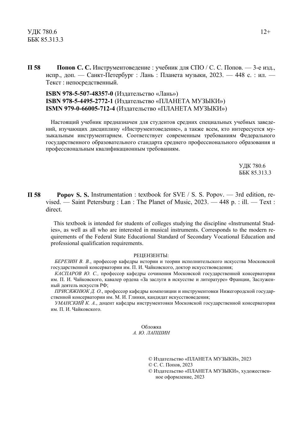 Настоящий учебник предназначен для студентов средних специальных учебных заведений, изучающих дисциплину «Инструментоведение», а также всем, кто интересуется музыкальным инструментарием. Соответствует современным требованиям Федерального государственного образовательного стандарта среднего профессионального образования и профессиональным квалификационным требованиям. This textbook is intended for students of colleges studying the discipline "Instrumental Studies", as well as all who are interested in musical instruments. Corresponds to the modern requirements of the Federal State Educational Standard of Secondary Vocational Education and professional qualification requirements.