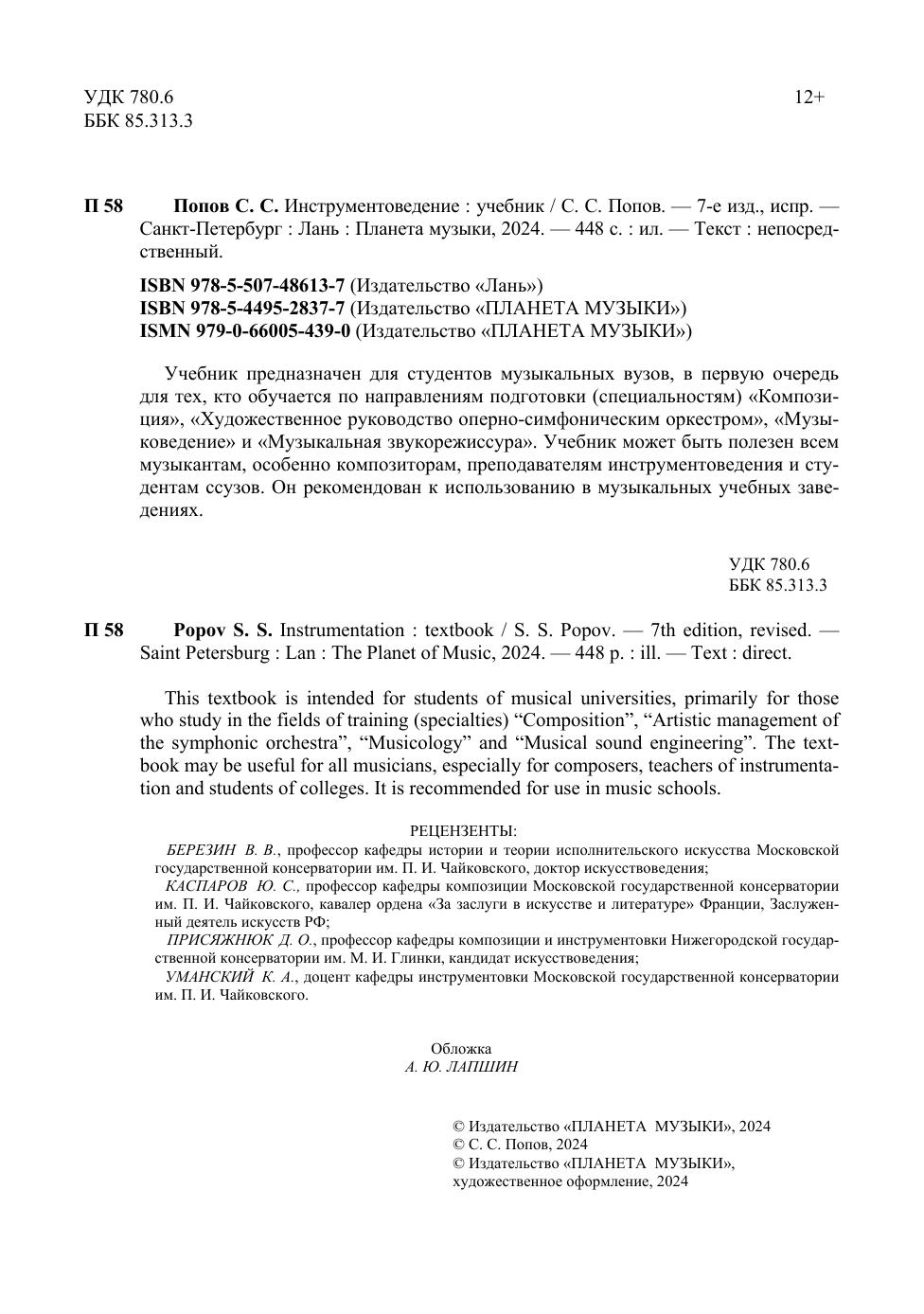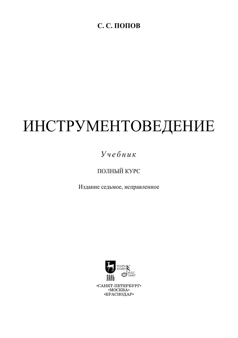 Учебник предназначен для студентов музыкальных вузов, в первую очередь для тех, кто обучается по направлениям подготовки (специальностям) «Композиция», «Художественное руководство оперно-симфоническим оркестром», «Музыковедение» и «Музыкальная звукорежиссура». Учебник может быть полезен всем музыкантам, особенно композиторам, преподавателям инструментоведения и студентам ссузов. Он рекомендован к использованию в музыкальных учебных заведениях. This textbook is intended for students of musical universities, primarily for those who study in the fi elds of training (specialties) “Composition”, “Artistic management of the symphonic orchestra”, “Musicology” and “Musical sound engineering”. The textbook may be useful for all musicians, especially for composers, teachers of instrumentation and students of colleges. It is recommended for use in music schools.