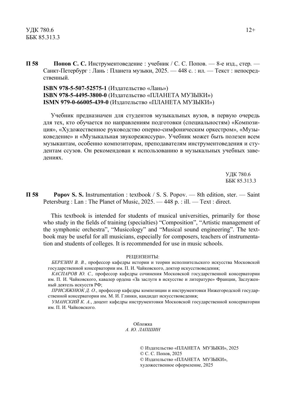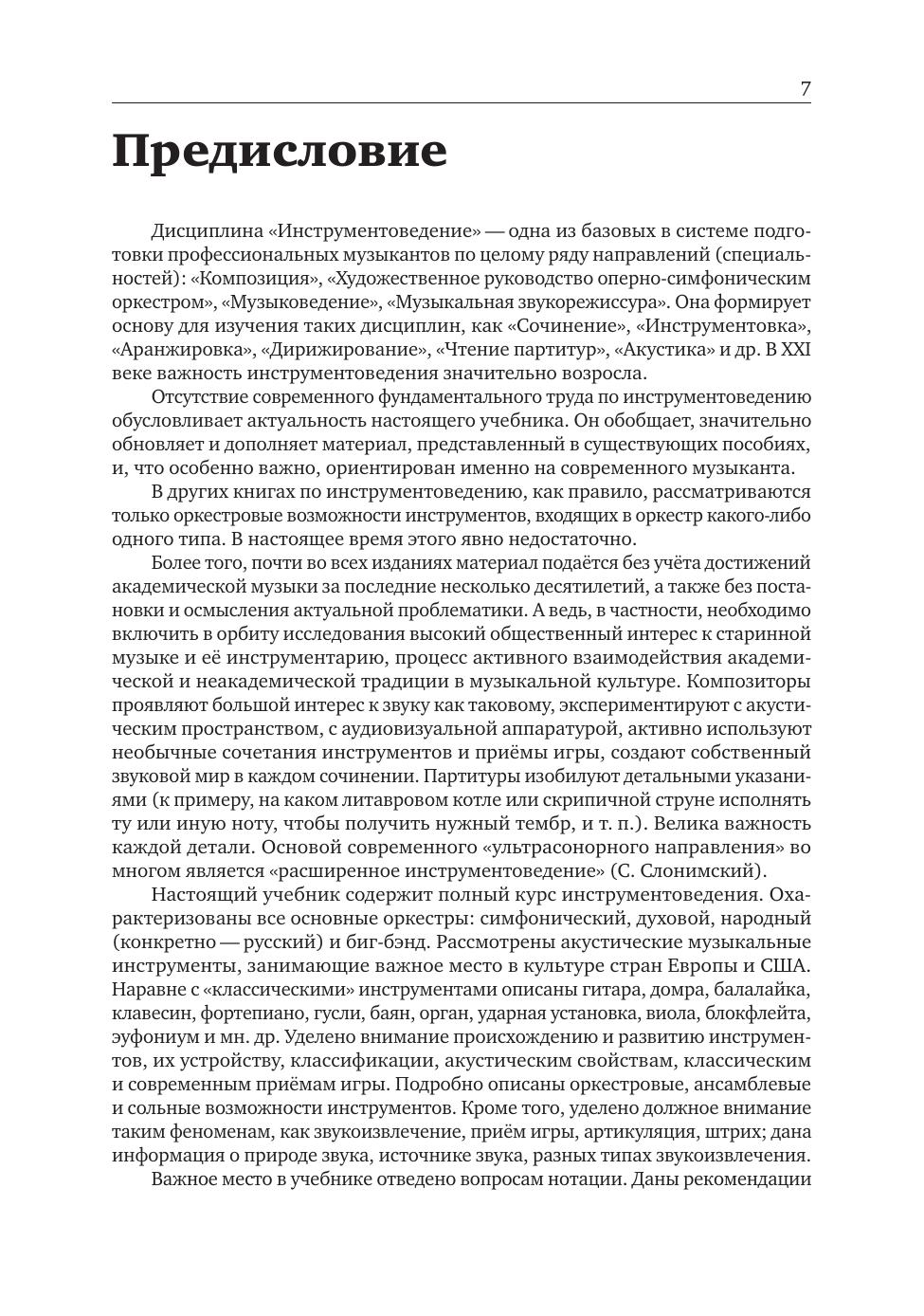 Учебник предназначен для студентов музыкальных вузов, в первую очередь для тех, кто обучается по направлениям подготовки (специальностям) «Композиция», «Художественное руководство оперно-симфоническим оркестром», «Музыковедение» и «Музыкальная звукорежиссура». Учебник может быть полезен всем музыкантам, особенно композиторам, преподавателям инструментоведения и студентам ссузов. Он рекомендован к использованию в музыкальных учебных заведениях. This textbook is intended for students of musical universities, primarily for those who study in the fi elds of training (specialties) “Composition”, “Artistic management of the symphonic orchestra”, “Musicology” and “Musical sound engineering”. The textbook may be useful for all musicians, especially for composers, teachers of instrumentation and students of colleges. It is recommended for use in music schools.
