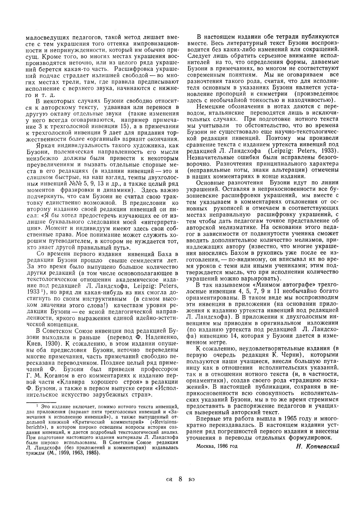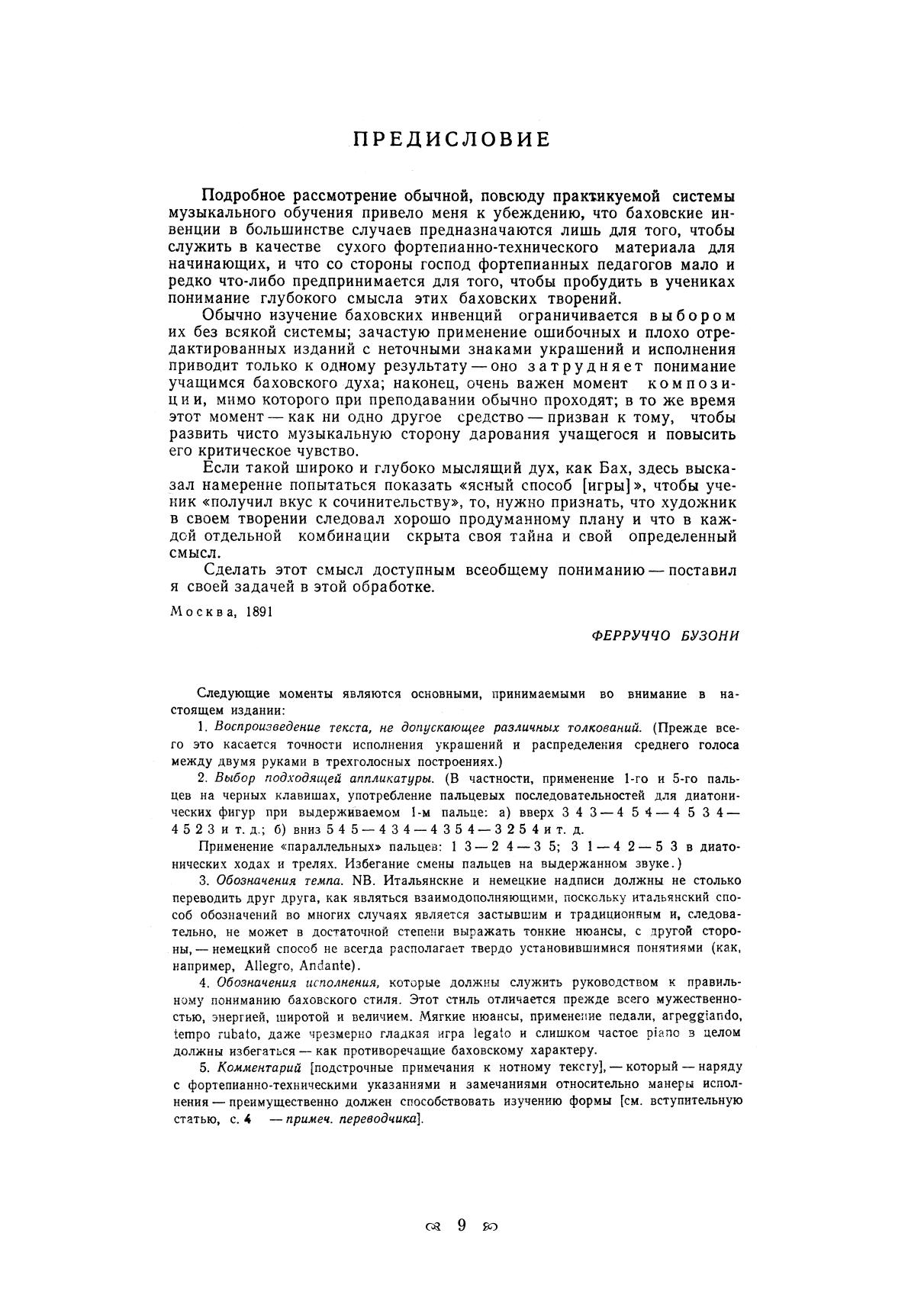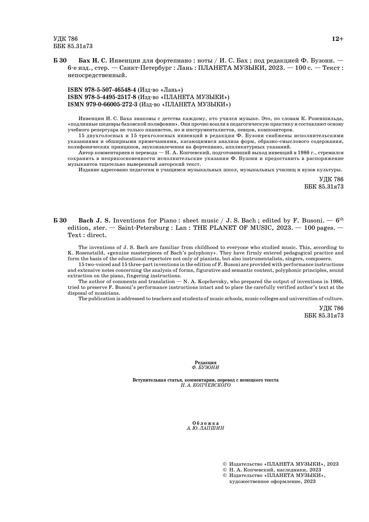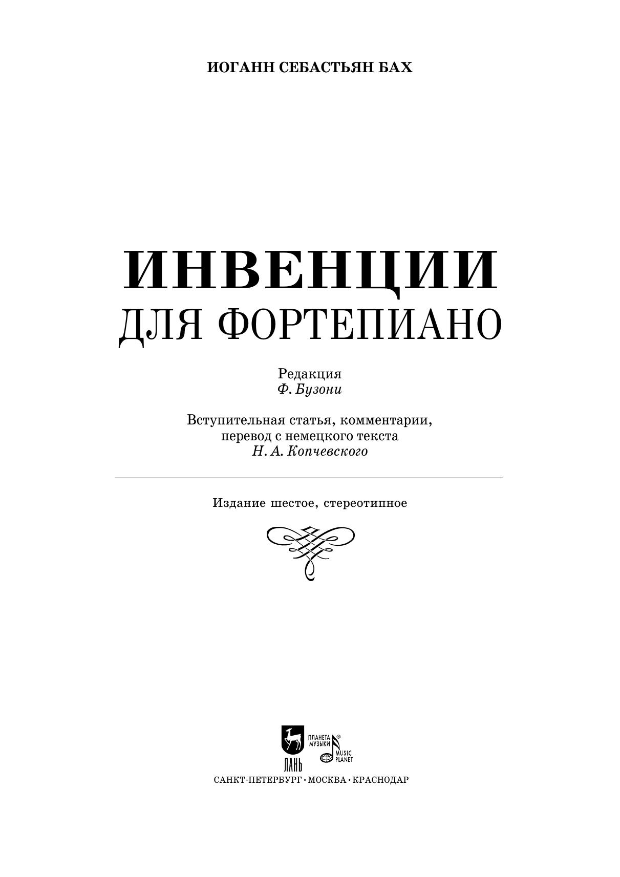 The author of comments and translation — N. A. Kopchevsky, who prepared the output of inventions in 1986, tried to preserve F. Busoni’s performance instructions intact and to place the carefully verified author’s text at the disposal of musicians.