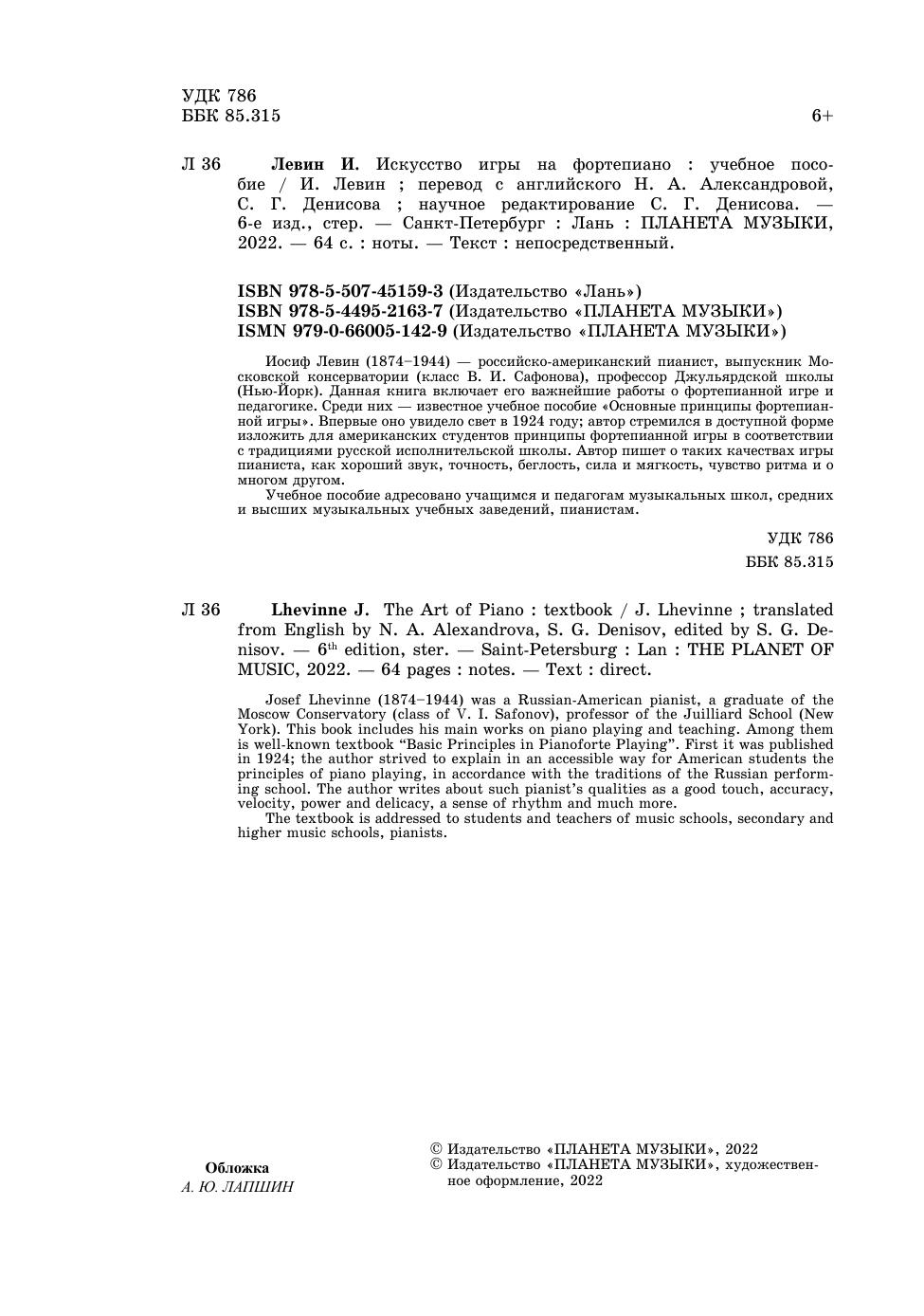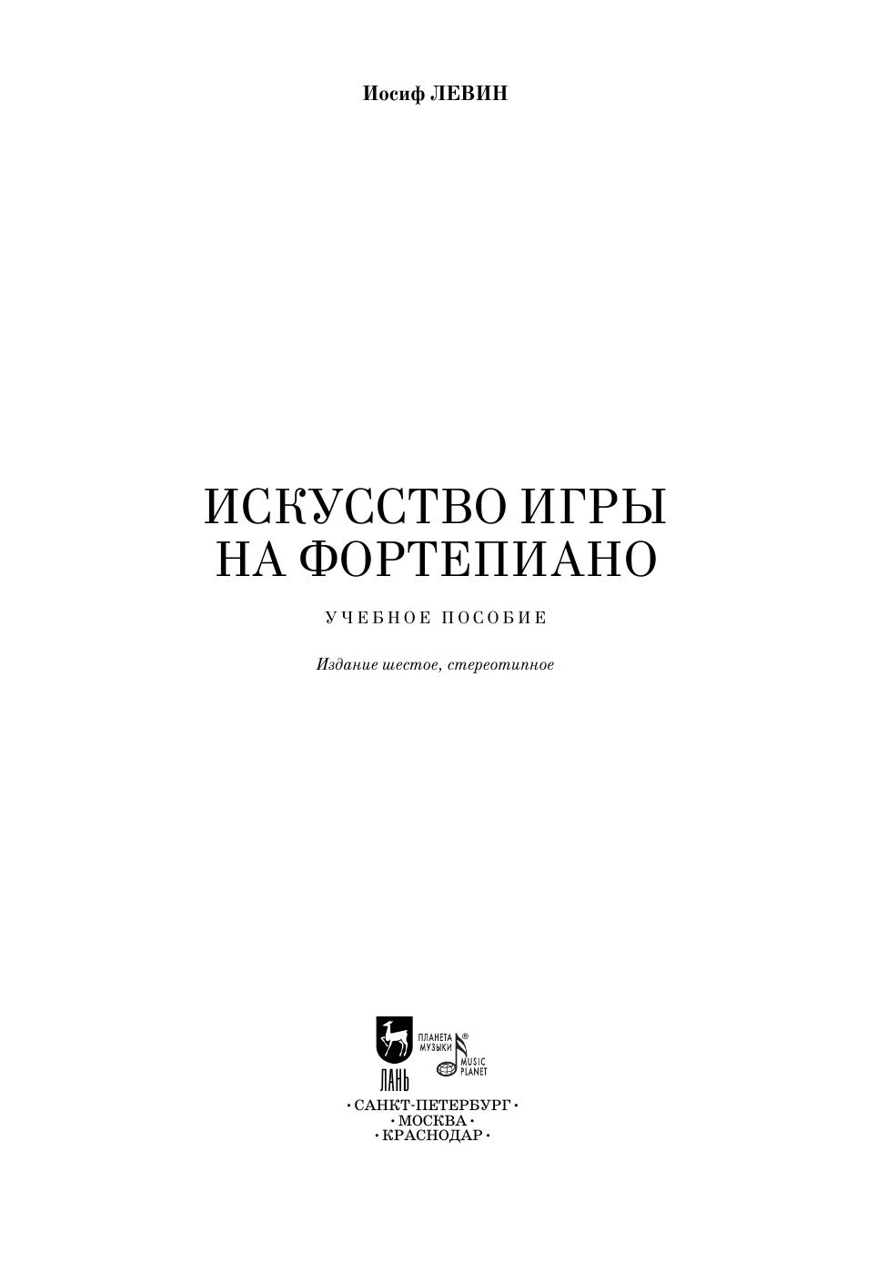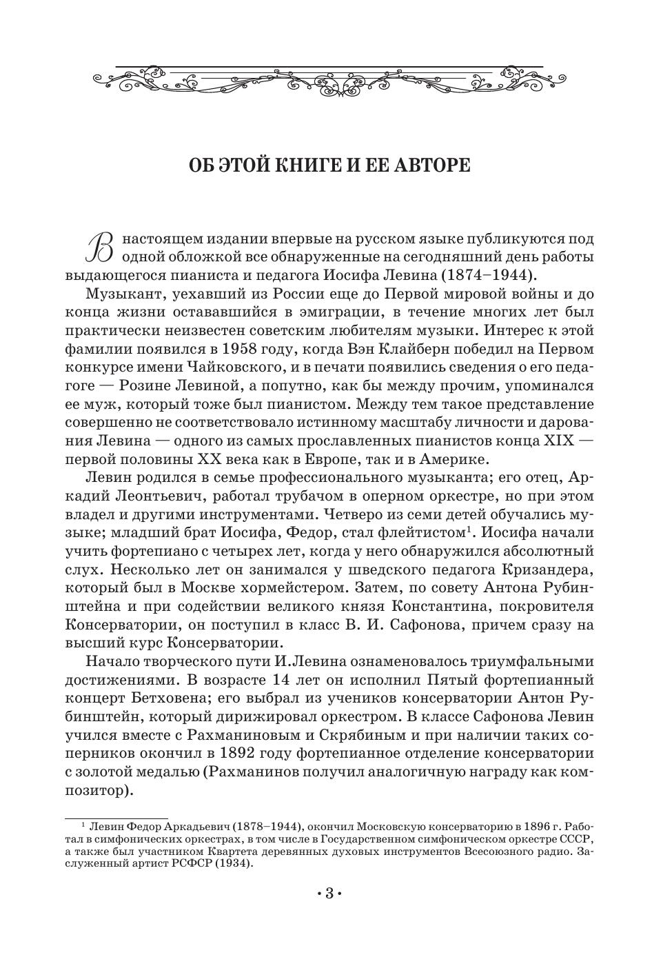 "Иосиф Левин (1874 – 1944) – российско-американский пианист, выпускник Московской консерватории (класс В. Сафонова), музыкальный педагог, преподававший в Джульярдской школе (Нью-Йорк). Данная книга – известное учебное пособие по фортепианной игре. Впервые оно увидело свет в 1924 году; автор стремился в доступной форме изложить для американских студентов принципы фортепианной игры в соответствии с традициями русской исполнительской школы. Автор пишет о таких качествах игры пианиста как хороший звук, точность, беглость, сила и мягкость, чувство ритма и о многом другом.