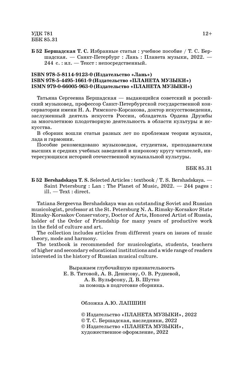Татьяна Сергеевна Бершадская — выдающийся советский и российский музыковед, профессор Санкт-Петербургской государственной консерватории имени Н. А. Римского-Корсакова, доктор искусствоведения, заслуженный деятель искусств России, обладатель Ордена Дружбы за многолетнюю плодотворную деятельность в области культуры и искусства.
