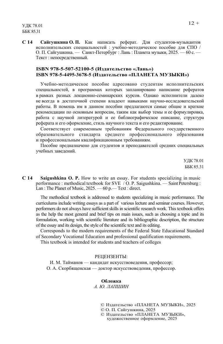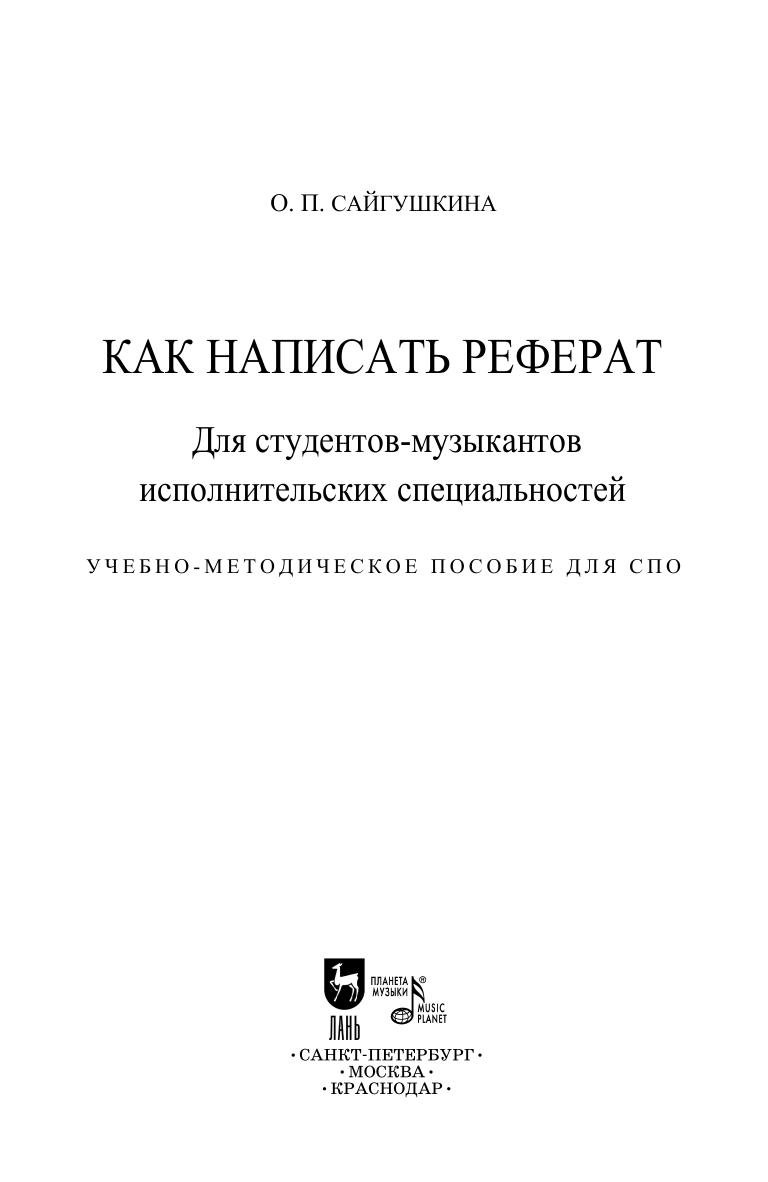 Учебно-методическое пособие адресовано студентам исполнительских специальностей, в программах которых запланировано написание рефератов в рамках разных лекционно-семинарских курсов. Однако исполнители далеко не всегда в достаточной степени владеют навыками научно-исследовательской работы. В помощь им в данном пособии предлагаются самые общие и краткие рекомендации по основным вопросам, таким как выбор темы и ее формулировка, работа с научной литературой и ее библиографическое описание, структура реферата и его оформление, стиль научного текста и его редактирование. Соответствует современным требованиям Федерального государственного образовательного стандарта среднего профессионального образования и профессиональным квалификационным требованиям. Пособие предназначено для студентов и преподавателей средних специальных учебных заведений. The methodical textbook is addressed to students specializing in music performance. The curriculums include writing essays as a part of various lecture and seminar courses. However, performers do not always have sufficient skills in scientific research work. This textbook offers as the help the most general and brief tips on main issues, such as choosing a topic and its formulation, working with scientific literature and its bibliographic description, the structure of the essay and its design, the style of the scientific text and its editing. Corresponds to the modern requirements of the Federal State Educational Standard of Secondary Vocational Education and professional qualification requirements. This textbook is intended for students and teachers of colleges.