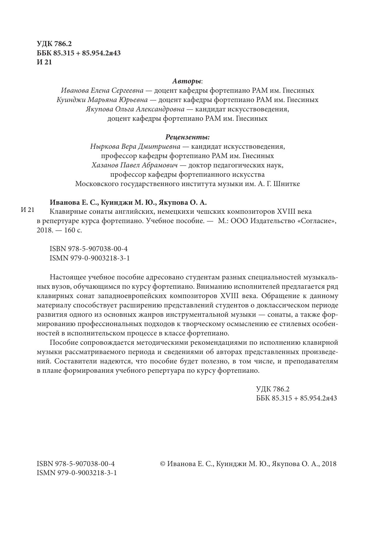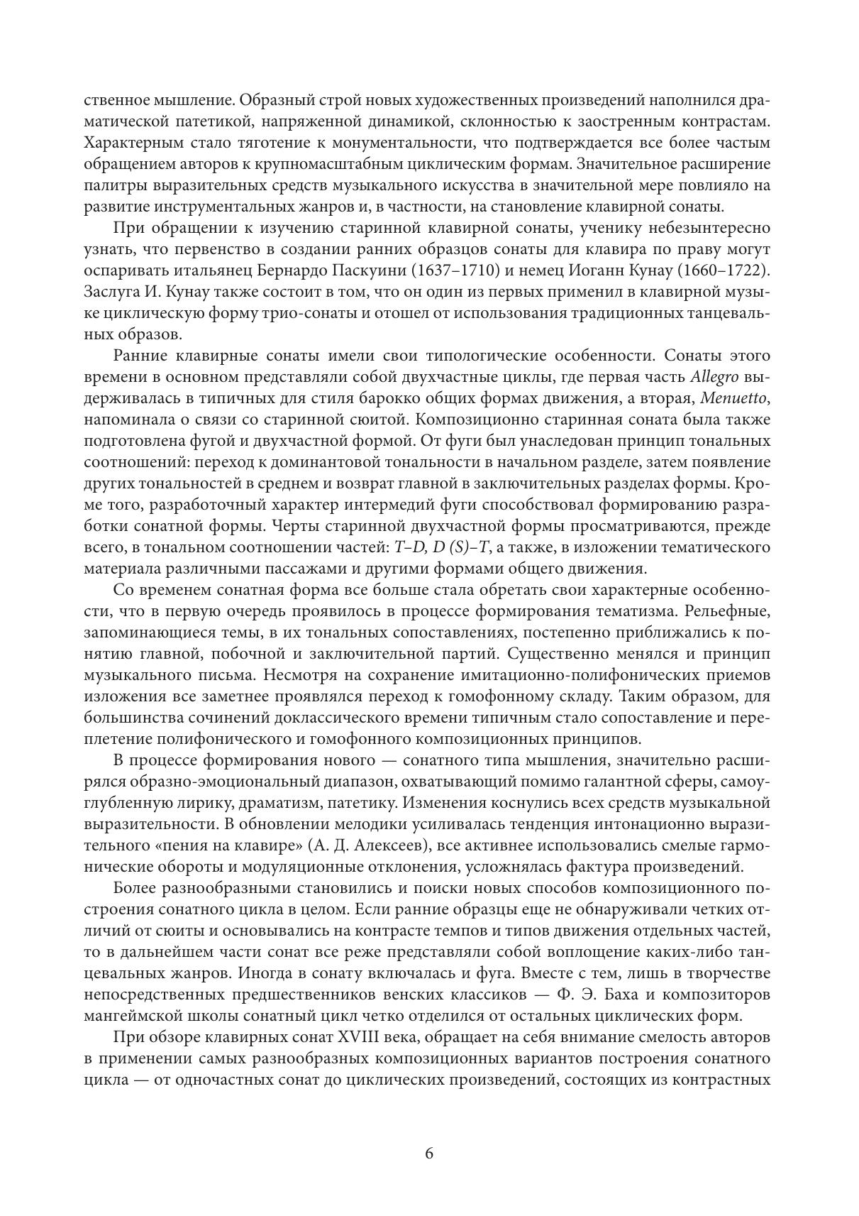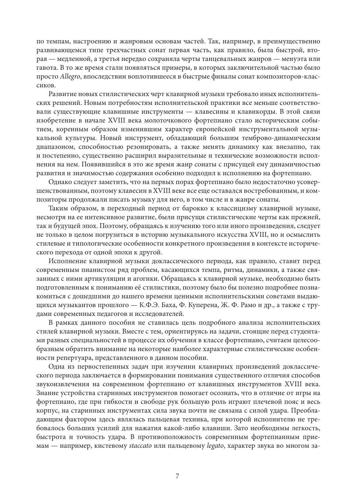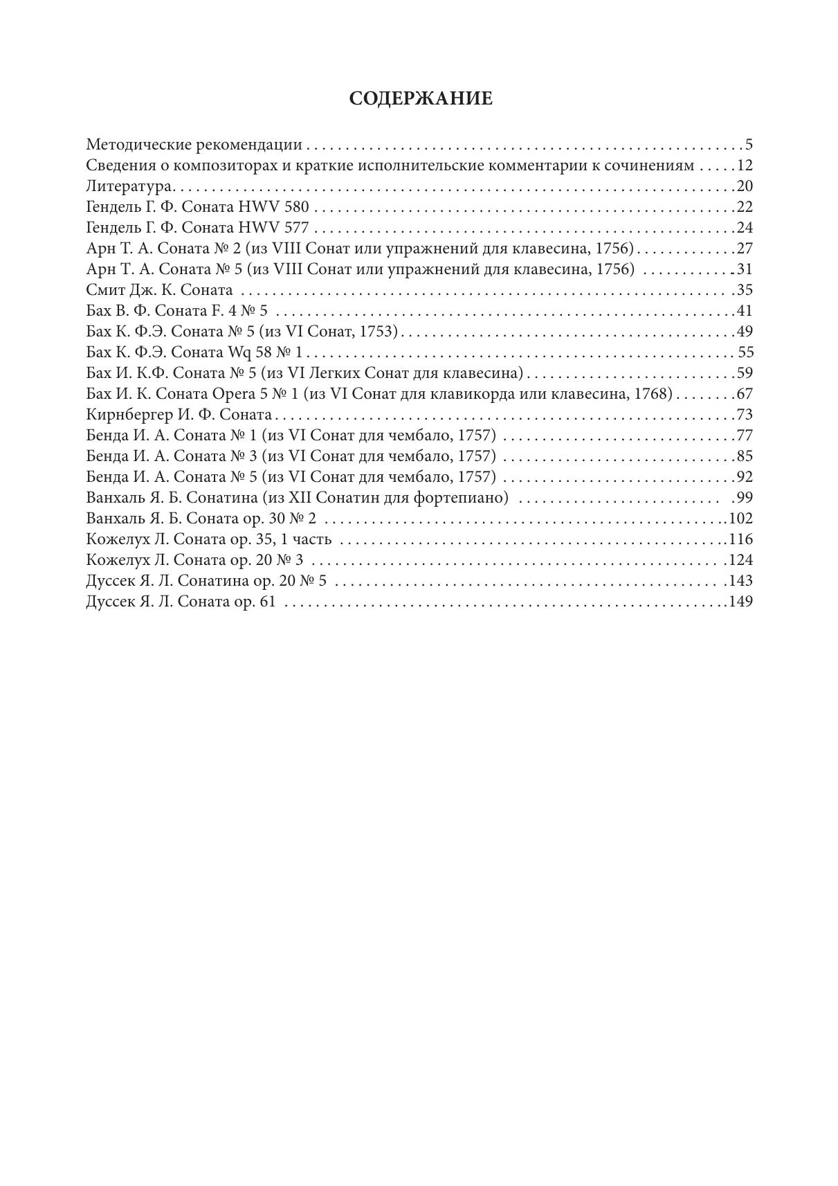Настоящее учебное пособие адресовано студентам разных специальностей музыкальных вузов, обучающимся по курсу фортепиано. Вниманию исполнителей предлагается ряд клавирных сонат западноевропейских композиторов XVIII века. Обращение к данному материалу способствует расширению представлений студентов о доклассическом периоде развития одного из основных жанров инструментальной музыки — сонаты, а также формированию профессиональных подходов к творческому осмыслению ее стилевых особенностей в исполнительском процессе в классе фортепиано. Пособие сопровождается методическими рекомендациями по исполнению клавирной музыки рассматриваемого периода и сведениями об авторах представленных произведений. Составители надеются, что пособие будет полезно, в том числе, и преподавателям в плане формирования учебного репертуара по курсу фортепиано.