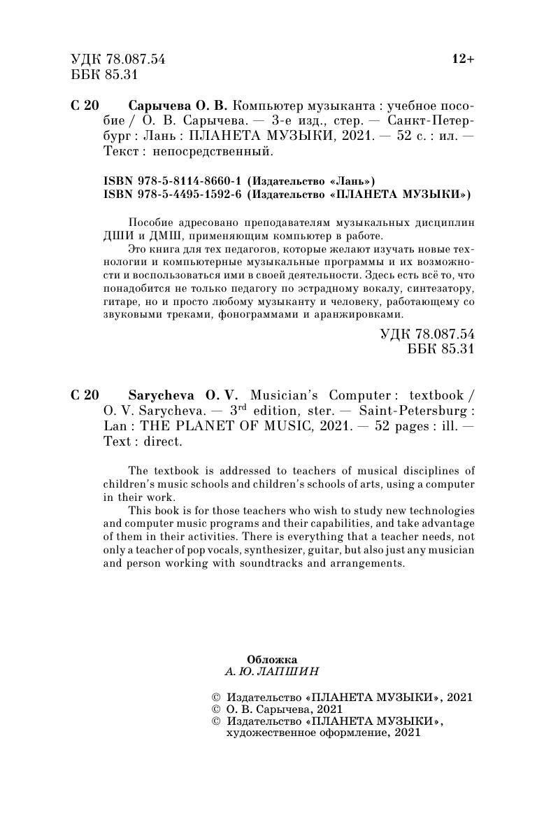 This book is for those teachers who wish to study new technologies and computer music programs and their capabilities, and take advantage of them in their activities. There is everything that a teacher needs, not only a teacher of pop vocals, synthesizer, guitar, but also just any musician and person working with soundtracks and arrangements.