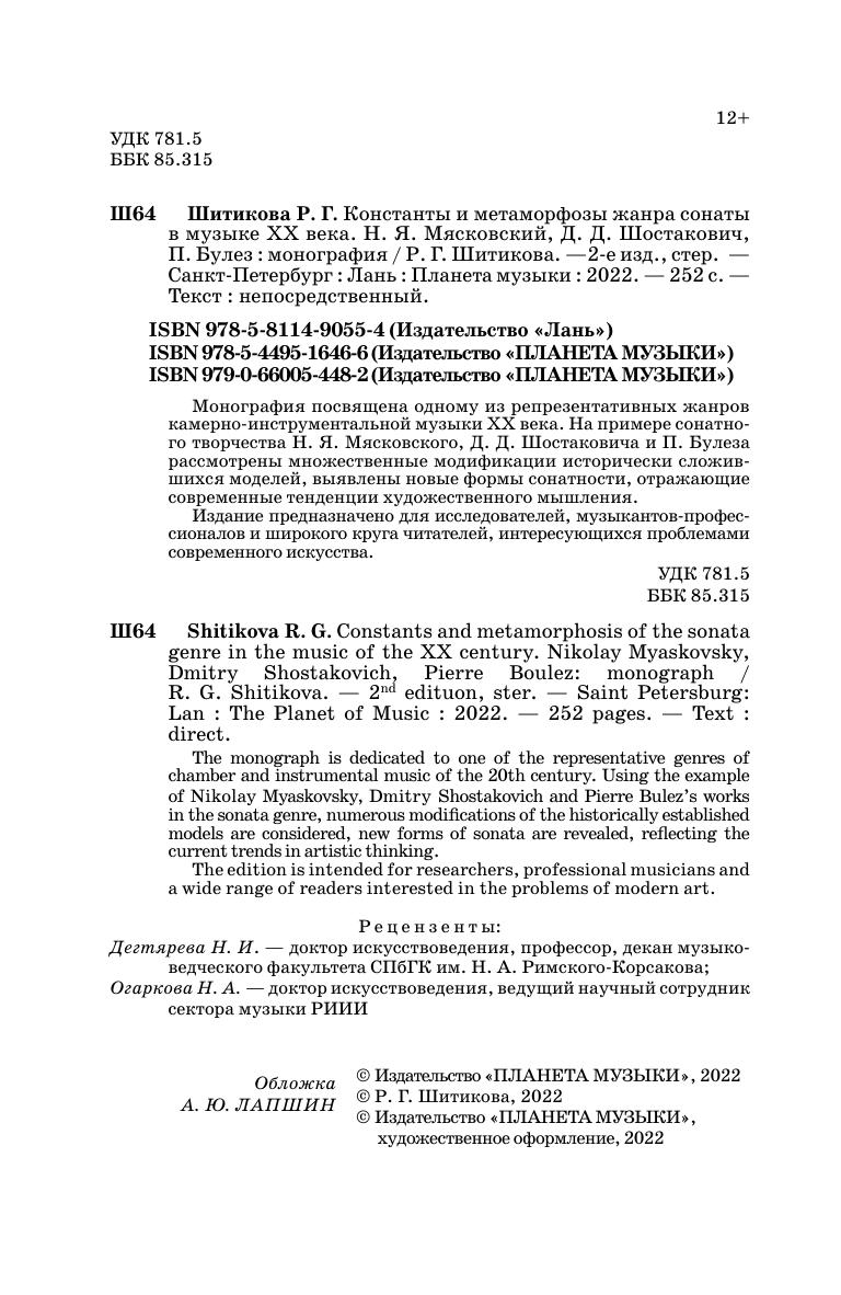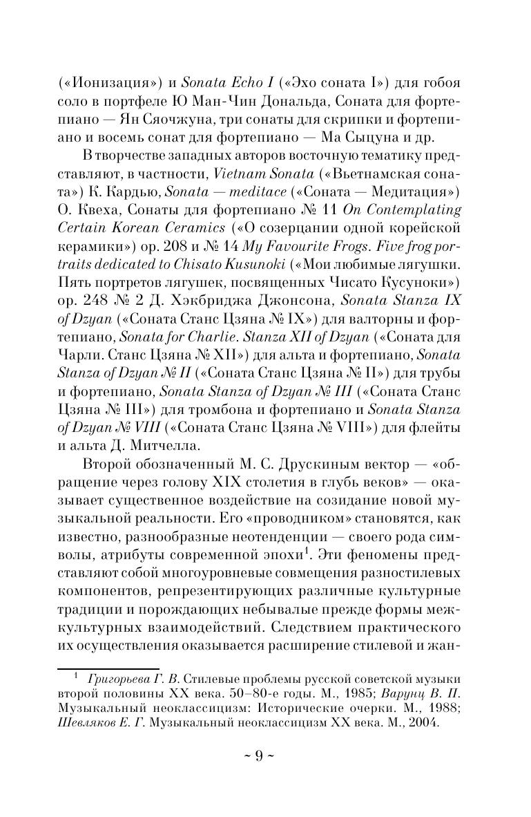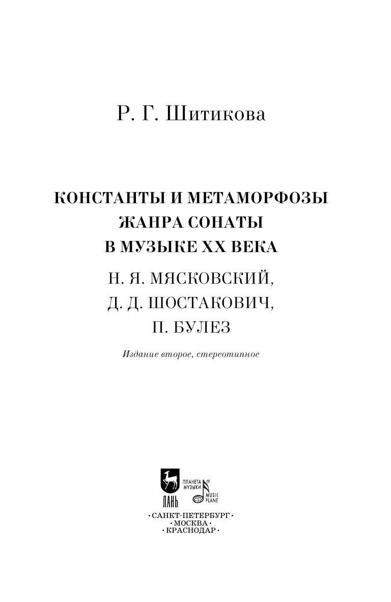 The monograph is dedicated to one of the representative genres of chamber and instrumental music of the 20th century. Using the example of N. Myaskovsky, D. Shostakovich and P. Bulez’s works in the sonata genre, numerous modifications of the historically established models are considered, new forms of sonata are revealed, reflecting the current trends in artistic thinking.