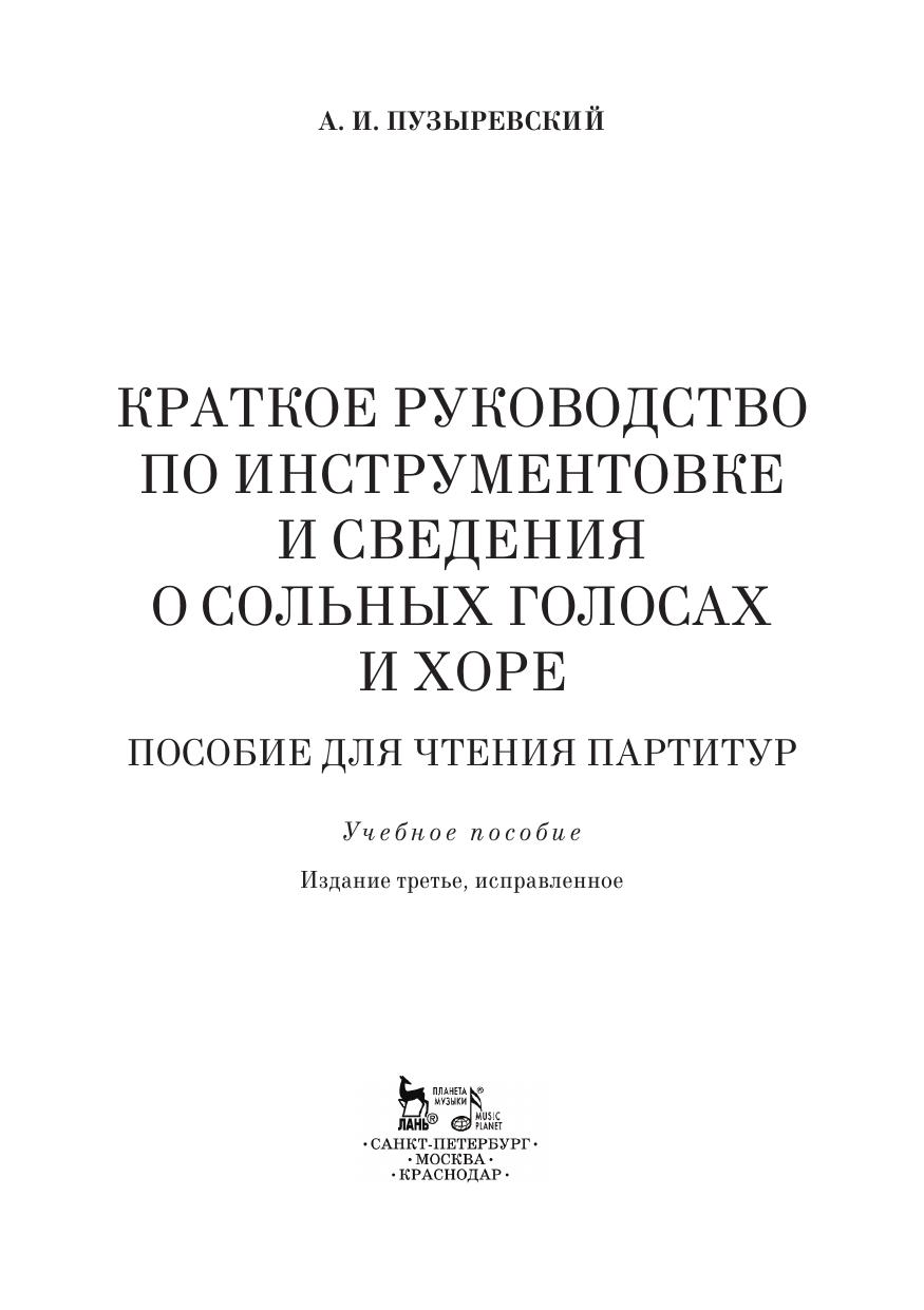 А. И. Пузыревский (1855–1917) — известный российский историк и теоретик музыки, педагог. Данная книга представляет собой краткое руководство по инструментовке, под которой понимается изложение музыкального произведения в виде партитуры для исполнения его оркестром, ансамблем или хором. В работе представлены сведения о сольных и хоровых голосах и оркестровых инструментах, необходимые для того, чтобы понимать партитуру, уметь разучивать ее и читать на фортепьяно. Рассматривается построение и чтение партитур, приводятся краткие сведения о разучивании хоровых и оркестровых сочинений и о дирижировании. В конце книги представлены изображения оркестровых инструментов, а также образцы партитур.
