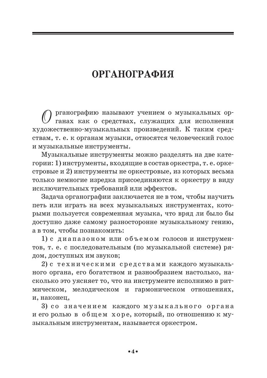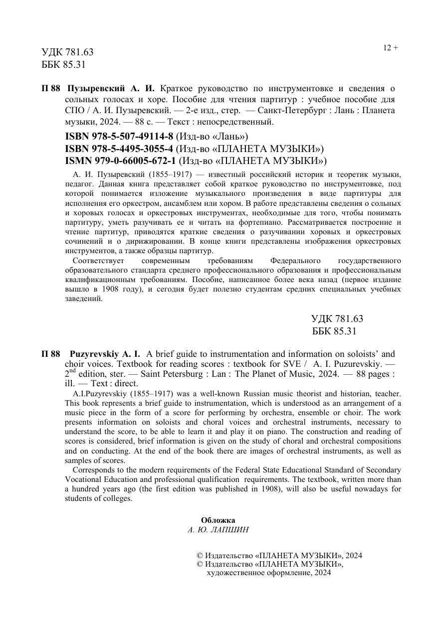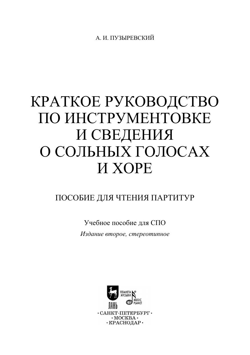 А. И. Пузыревский (1855–1917) — известный российский историк и теоретик музыки, педагог. Данная книга представляет собой краткое руководство по инструментовке, под которой понимается изложение музыкального произведения в виде партитуры для исполнения его оркестром, ансамблем или хором. В работе представлены сведения о сольных и хоровых голосах и оркестровых инструментах, необходимые для того, чтобы понимать партитуру, уметь разучивать ее и читать на фортепьяно. Рассматривается построение и чтение партитур, приводятся краткие сведения о разучивании хоровых и оркестровых сочинений и о дирижировании. В конце книги представлены изображения оркестровых инструментов, а также образцы партитур. Пособие, написанное более века назад (первое издание вышло в 1908 году), и сегодня будет полезно педагогам и студентам средних специальных учебных заведений. A.I.Puzyrevskiy (1855–1917) was a well-known Russian music theorist and historian, teacher. This book represents a brief guide to instrumentation, which is understood as an arrangement of a music piece in the form of a score for performing by orchestra, ensemble or choir. The work presents information on soloists and choral voices and orchestral instruments, necessary to understand the score, to be able to learn it and play it on piano. The construction and reading of scores is considered, brief information is given on the study of choral and orchestral compositions and on conducting. At the end of the book there are images of orchestral instruments, as well as samples of scores. The textbook, written more than a hundred years ago (the first edition was published in 1908), will also be useful nowadays for teachers and students of colleges.