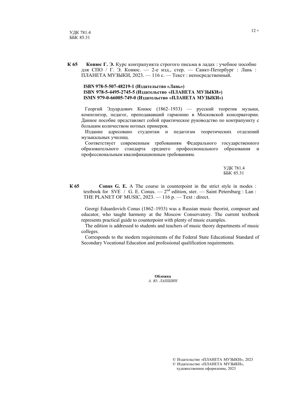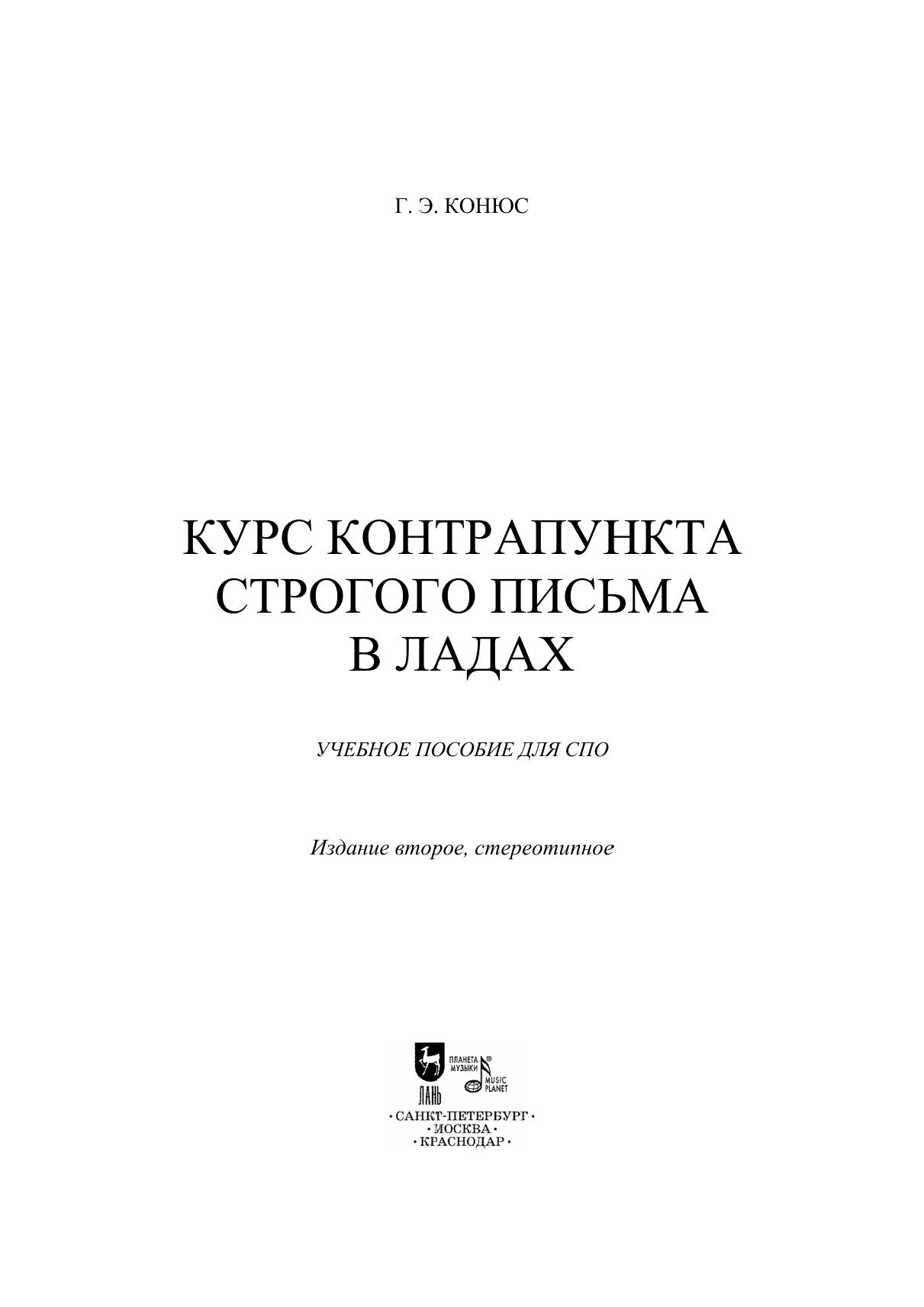 Георгий Эдуардович Конюс (1862–1933) — русский теоретик музыки, композитор, педагог, преподававший гармонии в Московской консерватории. Данное пособие представляет собой практическое руководство по контрапункту с большим количеством нотных примеров. Соответствует современным требованиям Федерального государственного образовательного стандарта среднего профессионального образования и профессиональным квалификационным требованиям. Издание адресовано студентам и педагогам теоретических отделений музыкальных училищ. Georgi Eduardovich Conus (1862–1933) was a Russian music theorist, composer and educator, who taught harmony at the Moscow Conservatory. The current textbook represents practical guide to counterpoint with plenty of music examples. Corresponds to the modern requirements of the Federal State Educational Standard of Secondary Vocational Education and professional qualification requirements. The edition is addressed to students and teachers of music theory departments of music colleges.